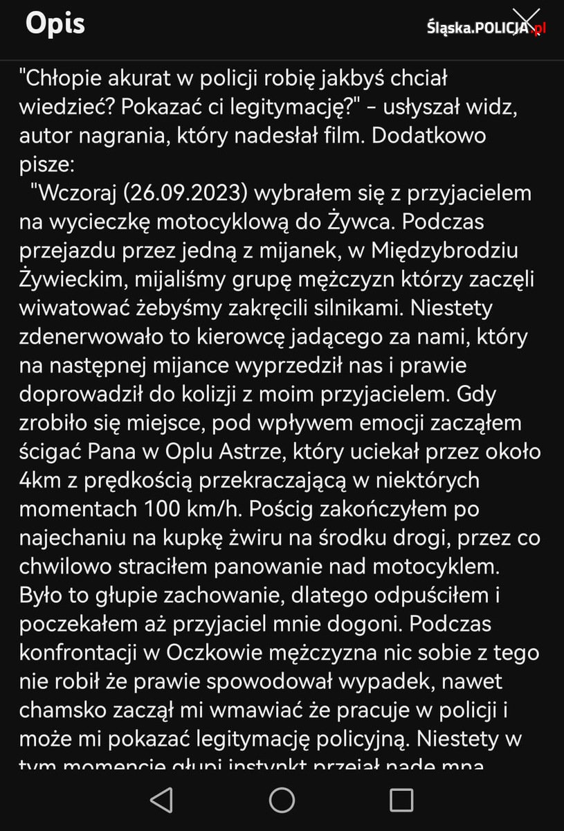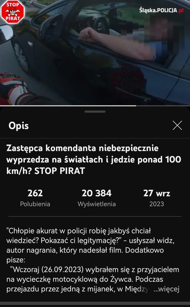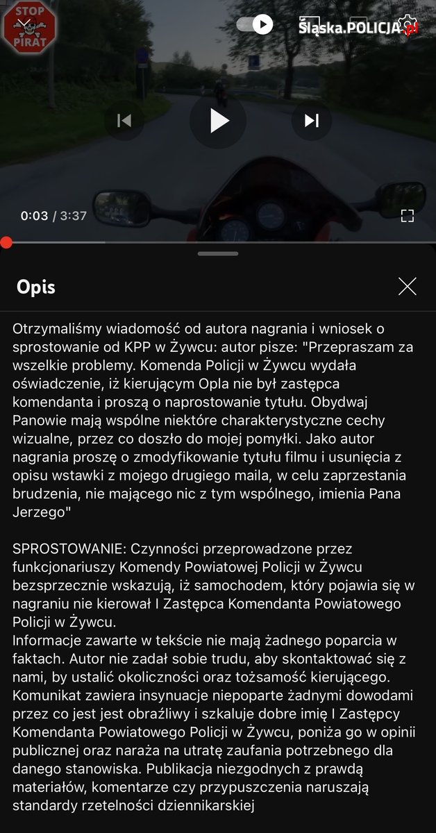 "Przepraszam za wszelkie problemy. Komenda Policji w Żywcu wydała oświadczenie, iż kierującym Opla nie był zastępca komendanta i proszą o naprostowanie tytułu. Obydwaj Panowie mają wspólne niektóre charakterystyczne cechy wizualne, przez co doszło do mojej pomyłki. Jako autor nagrania proszę o zmodyfikowanie tytułu filmu i usunięcia z opisu wstawki z mojego drugiego maila, w celu zaprzestania brudzenia, nie mającego nic z tym wspólnego, imienia Pana Jerzego".