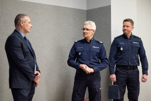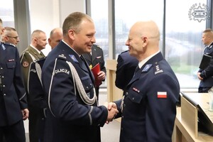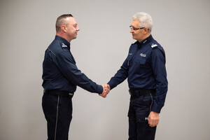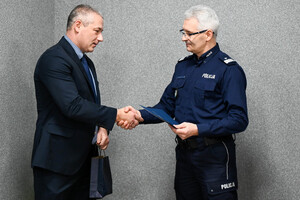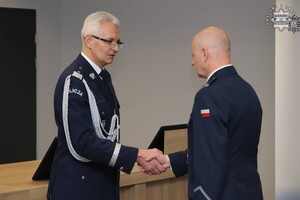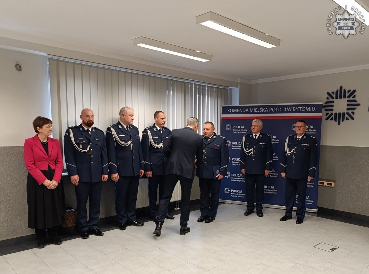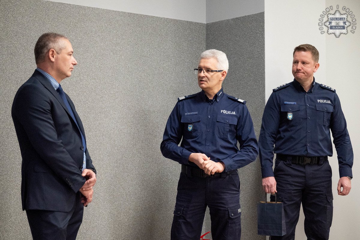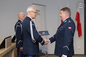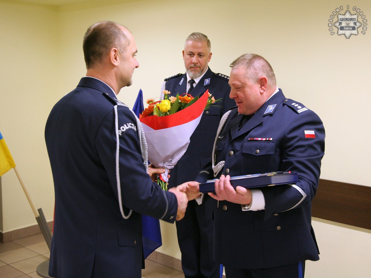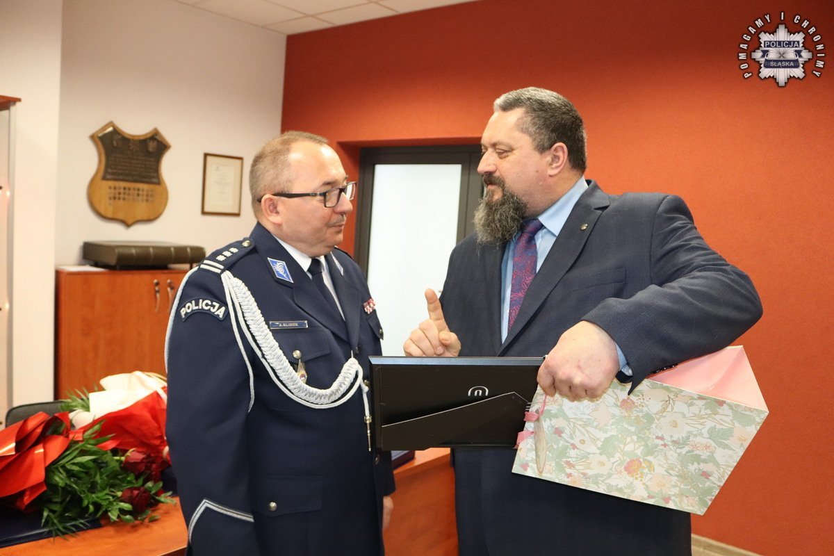 Podziękowania i gratulacje dchodzącemu oficerowi złożył osobiście nadinspektor Mariusz Krzystyniak - Komendant Wojewódzki Policji w Katowicach w obecności swojego Pierwszego Zastępcy - inspektora Radosława Kacprzaka oraz Zastępcy - inspektora Jacka Stelmacha.