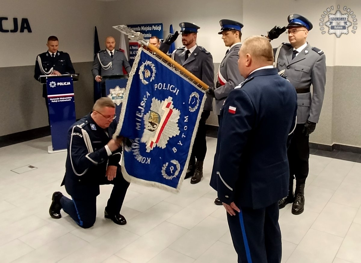 Inspektor Andrzej Brzozowski pożegnał się ze sztandarem Komendy Miejskiej Policji w Bytomiu. Jeszcze tego samego dnia powitał policjantów w Komendzie Miejskiej Policji w Chorzowie, gdzie teraz będzie pełnił obowiązki Komendanta.