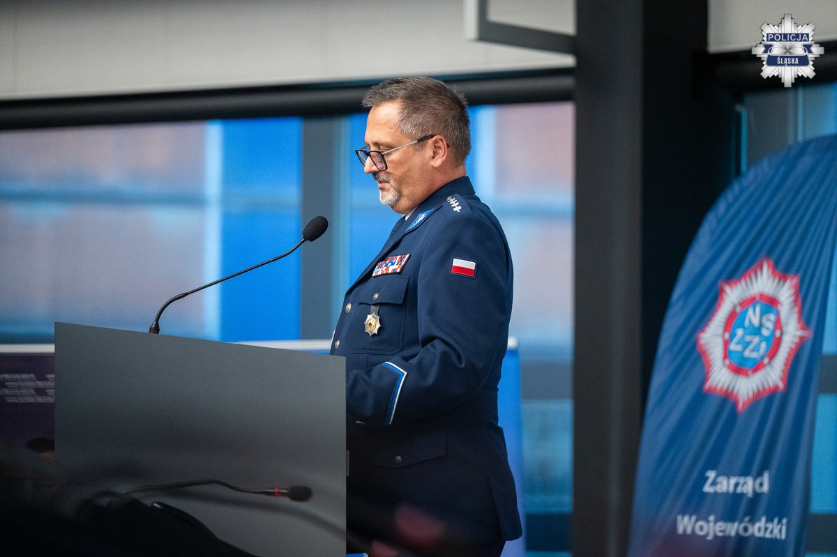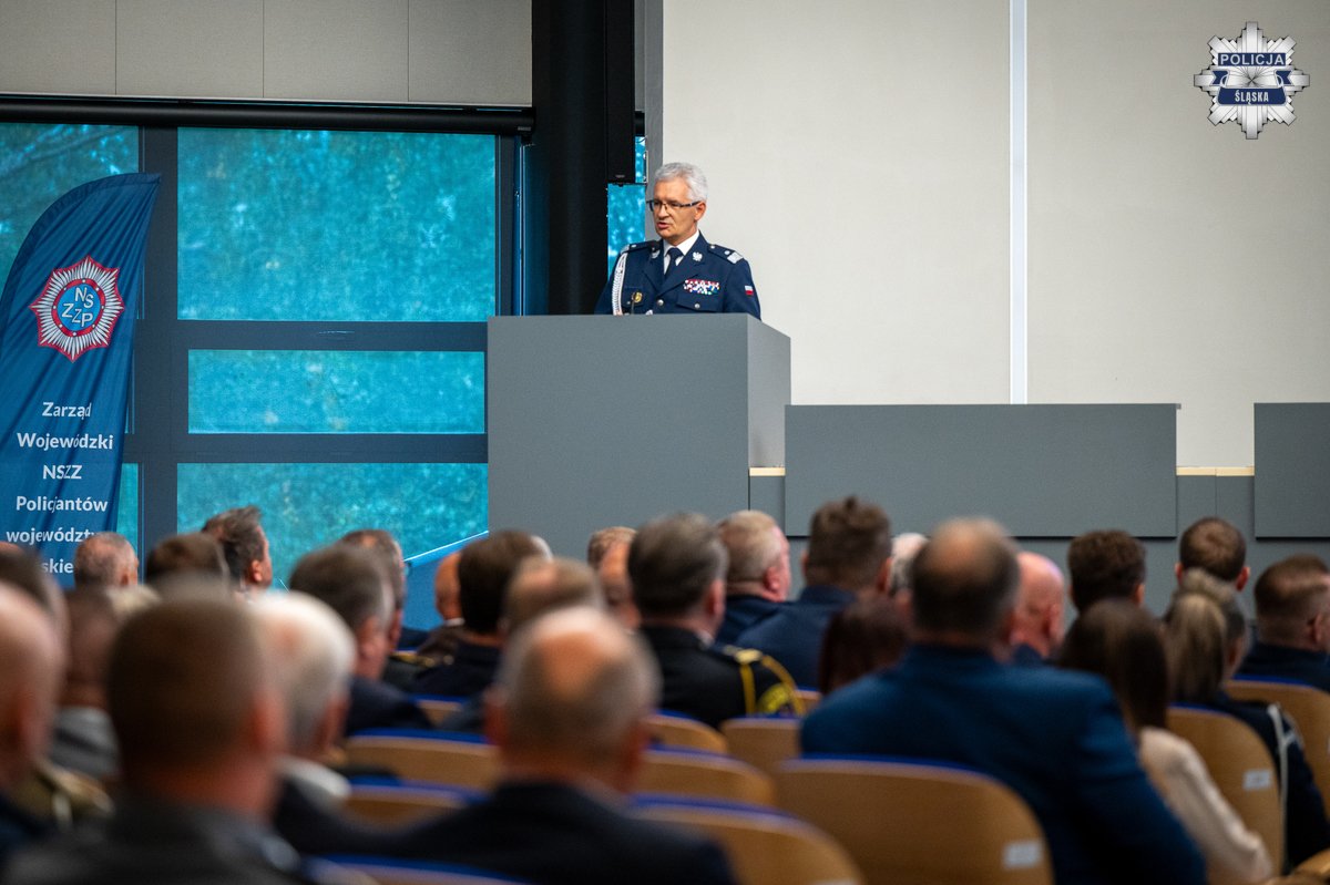 Wszystkich zaproszonych gości uroczyście przywitał Przewodniczący Zarządu Wojewódzkiego NSZZP województwa śląskiego asp. sztab. Michał Szczęśniak, który podziękował wszystkim zebranym za zaangażowanie i wsparcie organizacji związkowej, nawiązując do jej 35-letniej historii.