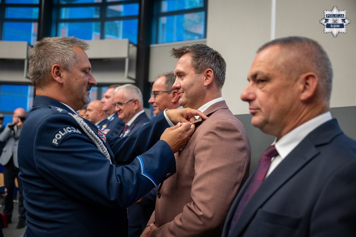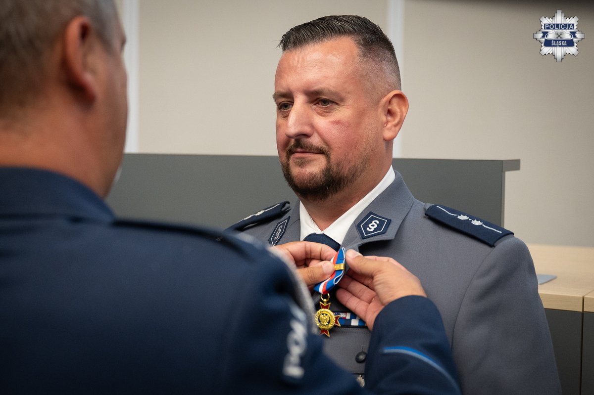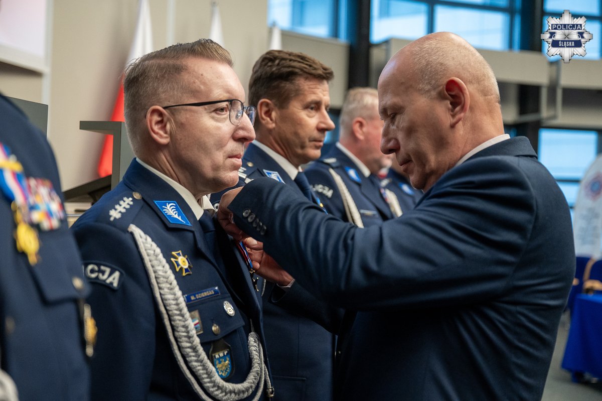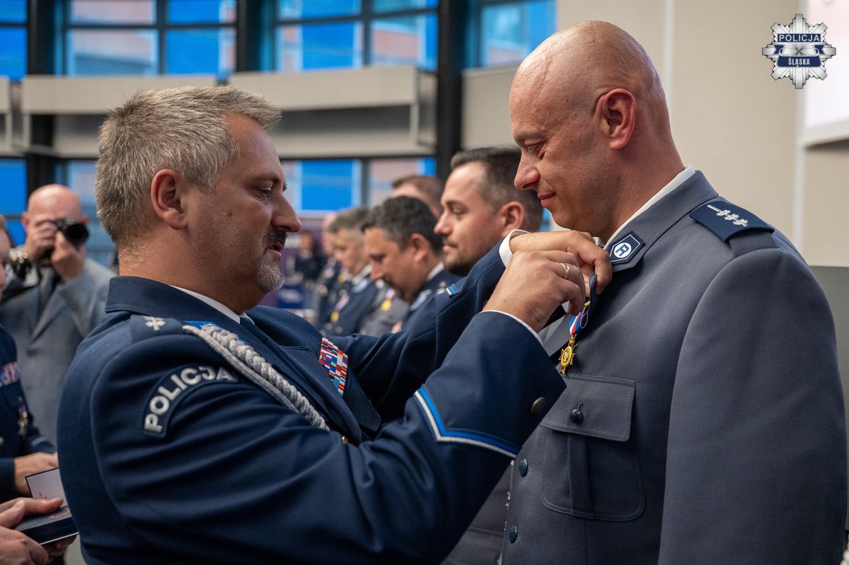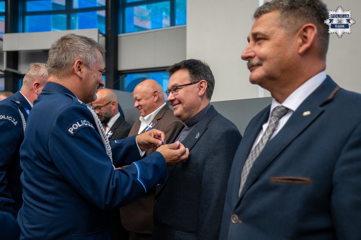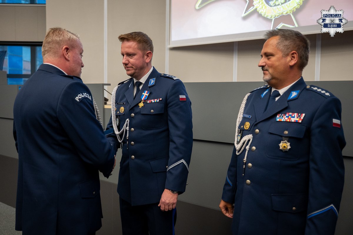 Wyróżnieni otrzymali medale z rąk Przewodniczącego NSZZP województwa śląskiego asp. sztab. Michała Szczęśniaka, któremu towarzyszyli wiceprzewodniczący związku: asp. szt. Andrzej Socha oraz asp. szt. Maciej Dziergas.