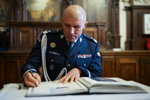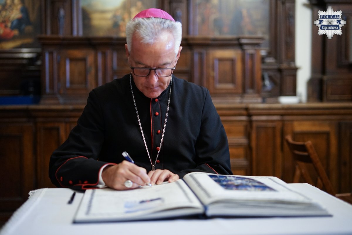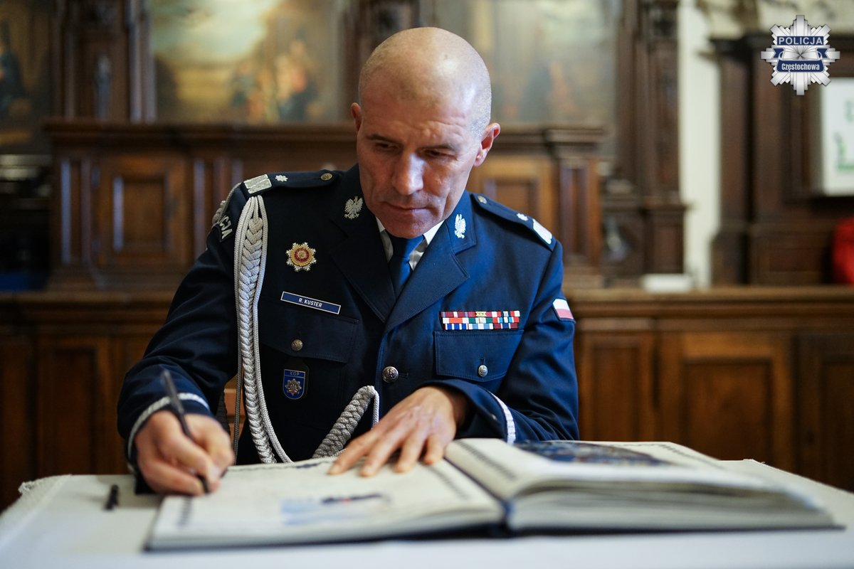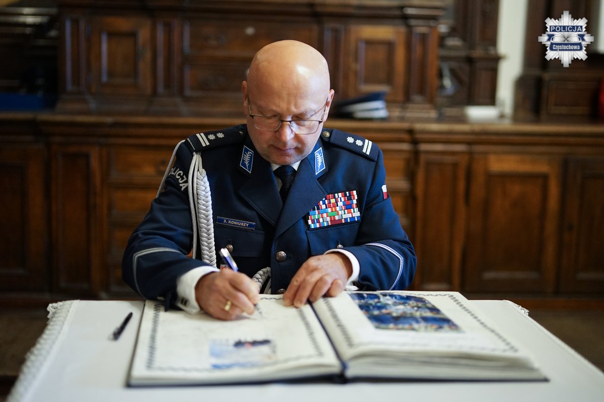 Po uroczystości nadinspektor Roman Kuster – Zastępca Komendanta Głównego Policji i JE ksiądz biskup Wiesław Lechowicz oraz młodszy inspektor Sławomir Koniuszy - Wiceprzewodniczący Zarządu Głównego NSZZ Policjantów, dokonali wpisu do księgi pamiątkowej Komendy Miejskiej Policji w Częstochowie.