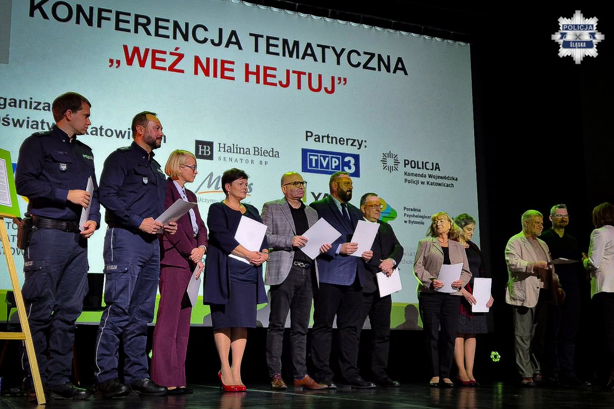 W Bytomskim Centrum Kultury odbyła się konferencja inaugurująca program profilaktyki społecznej „Weź nie hejtuj”, organizowana w ramach Tygodnia Przeciwdziałania Przemocy Rówieśniczej i Tygodnia Budowania Relacji. Partnerami wydarzenia byli także śląscy policjanci. W wydarzeniu uczestniczyli m.in. Wojewoda Śląski Marek Wójcik, Śląska Kurator Oświaty Aleksandra Dyla, parlamentarzyści oraz władze miasta Bytom. Policję reprezentowali mundurowi z Wydziału Prewencji Komendy Wojewódzkiej Policji w Katowicach, na czele z Zastępcą Naczelnika podinsp. Mariuszem Szczepańskim.