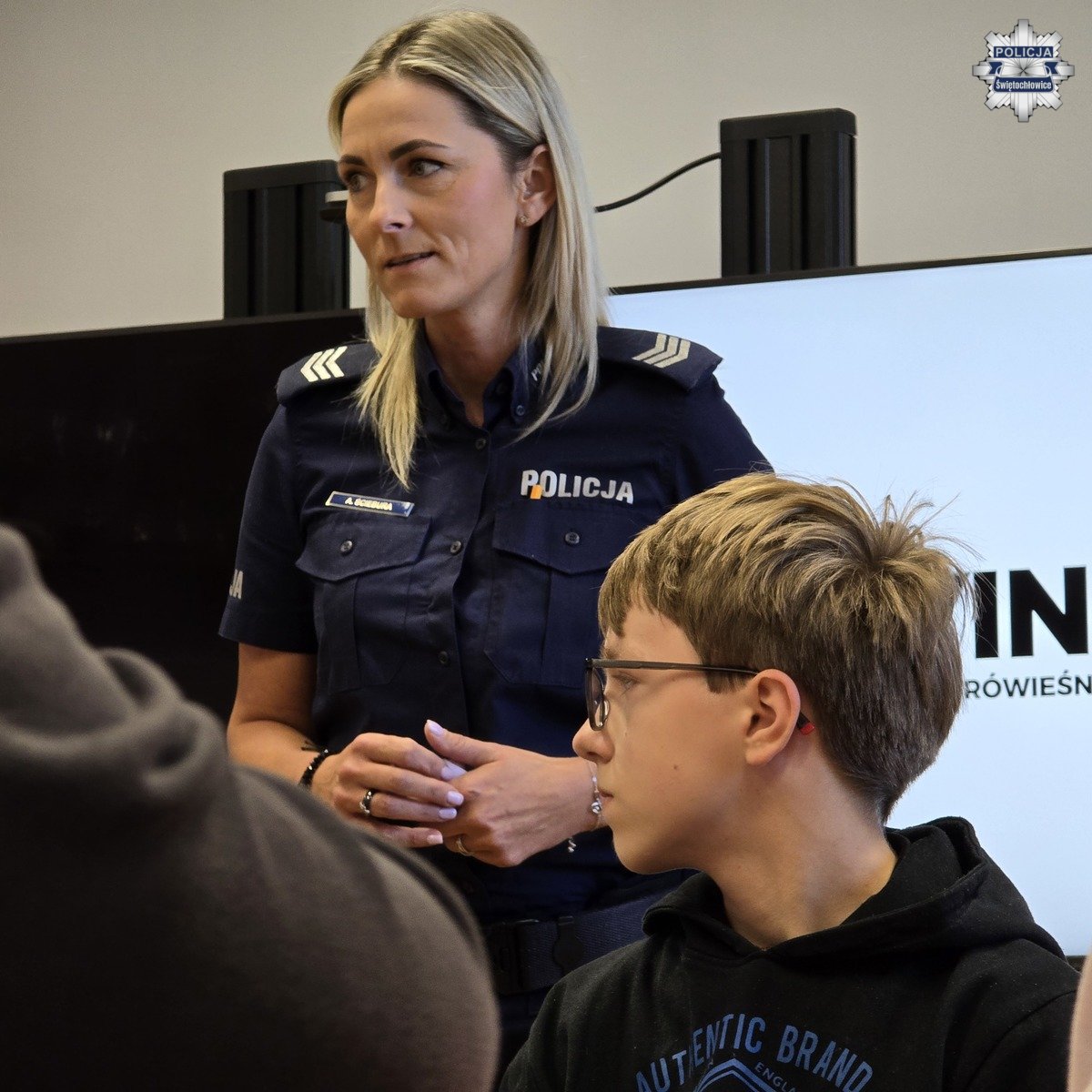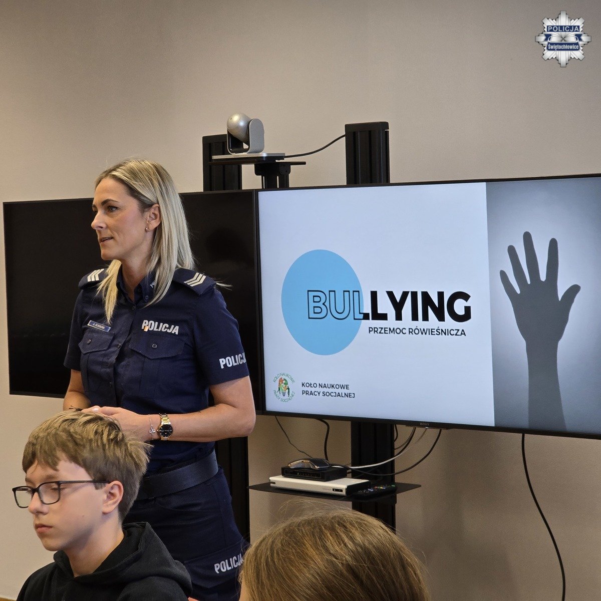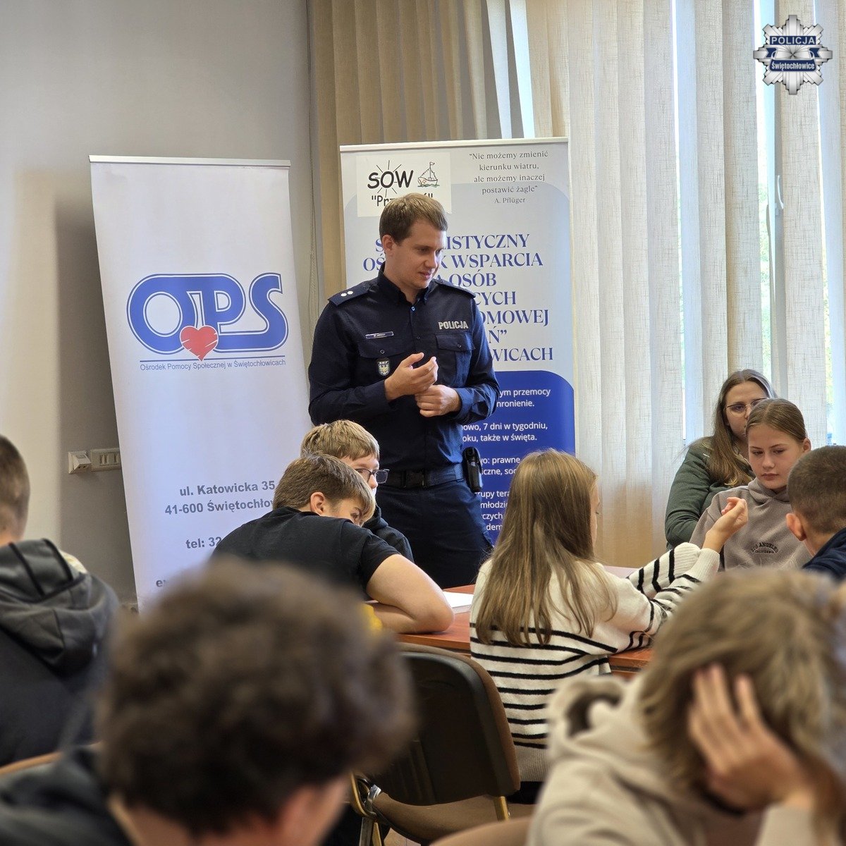 Kolejnym prelegentem był podkomisarz Mateusz Jaroch z Komendy Wojewódzkiej Policji w Katowicach, który opowiedział dzieciom o zagrożeniach w sieci, cyberprzemocy, hejcie i mowie nienawiści. Policjant w prosty i obrazowy sposób wyjaśnił, jakie zachowania w internecie mogą skrzywdzić drugą osobę oraz jakie konsekwencje grożą za takie działania. Na zakończenie spotkania podkomisarz Jaroch zorganizował dla uczniów grę edukacyjną, która w ciekawy sposób zobrazowała mechanizm działania stereotypów i pokazała, jak łatwo mogą one prowadzić do uprzedzeń i niesprawiedliwego oceniania innych.