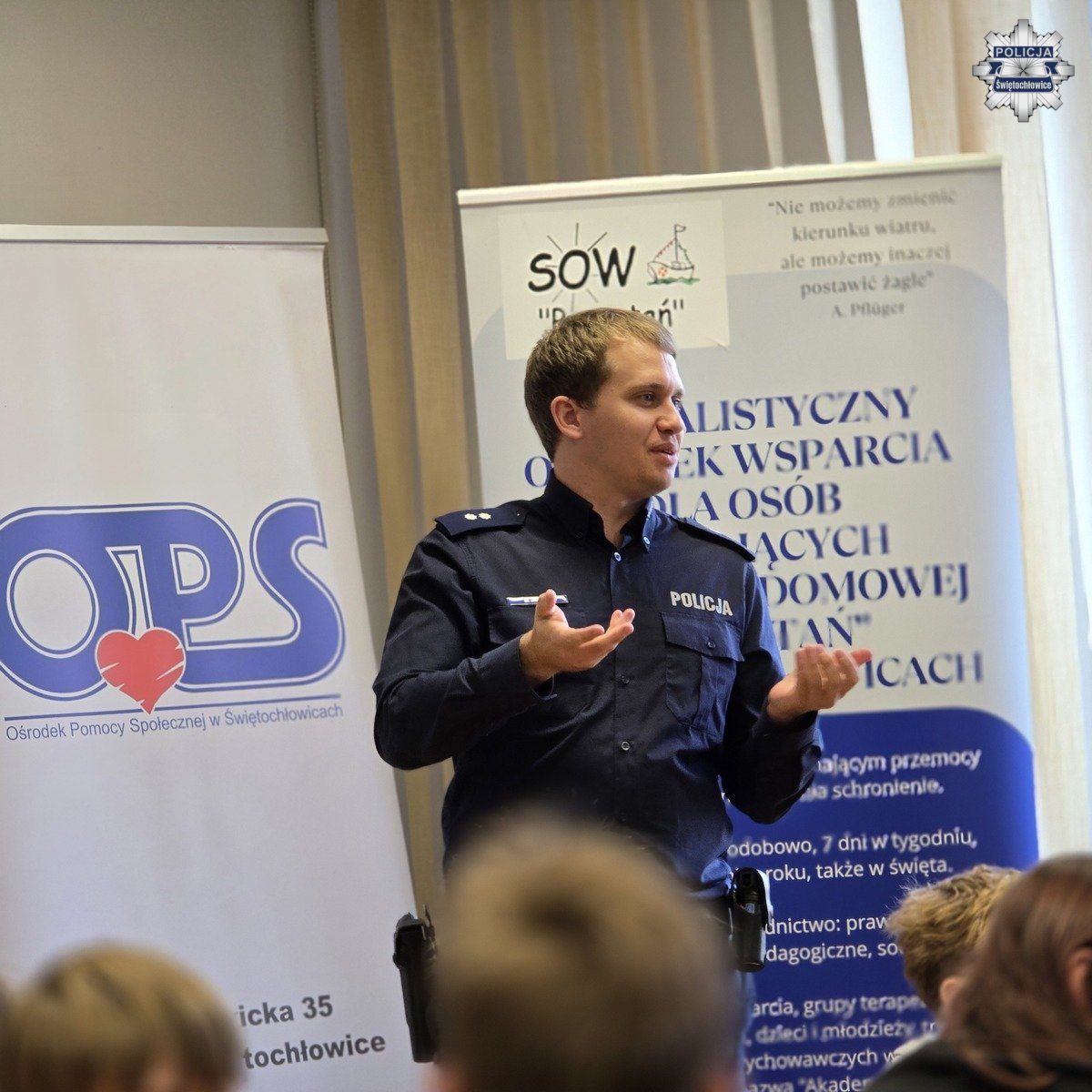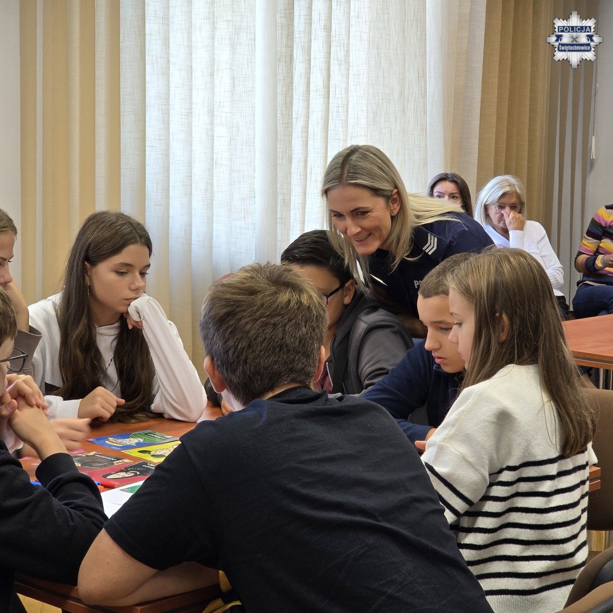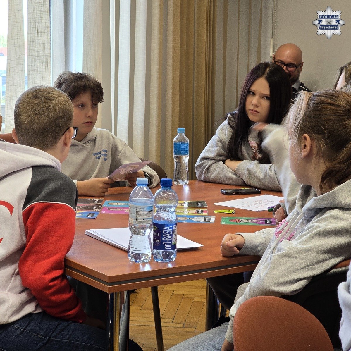 Kolejnym prelegentem był podkomisarz Mateusz Jaroch z Komendy Wojewódzkiej Policji w Katowicach, który opowiedział dzieciom o zagrożeniach w sieci, cyberprzemocy, hejcie i mowie nienawiści. Policjant w prosty i obrazowy sposób wyjaśnił, jakie zachowania w internecie mogą skrzywdzić drugą osobę oraz jakie konsekwencje grożą za takie działania. Na zakończenie spotkania podkomisarz Jaroch zorganizował dla uczniów grę edukacyjną, która w ciekawy sposób zobrazowała mechanizm działania stereotypów i pokazała, jak łatwo mogą one prowadzić do uprzedzeń i niesprawiedliwego oceniania innych.