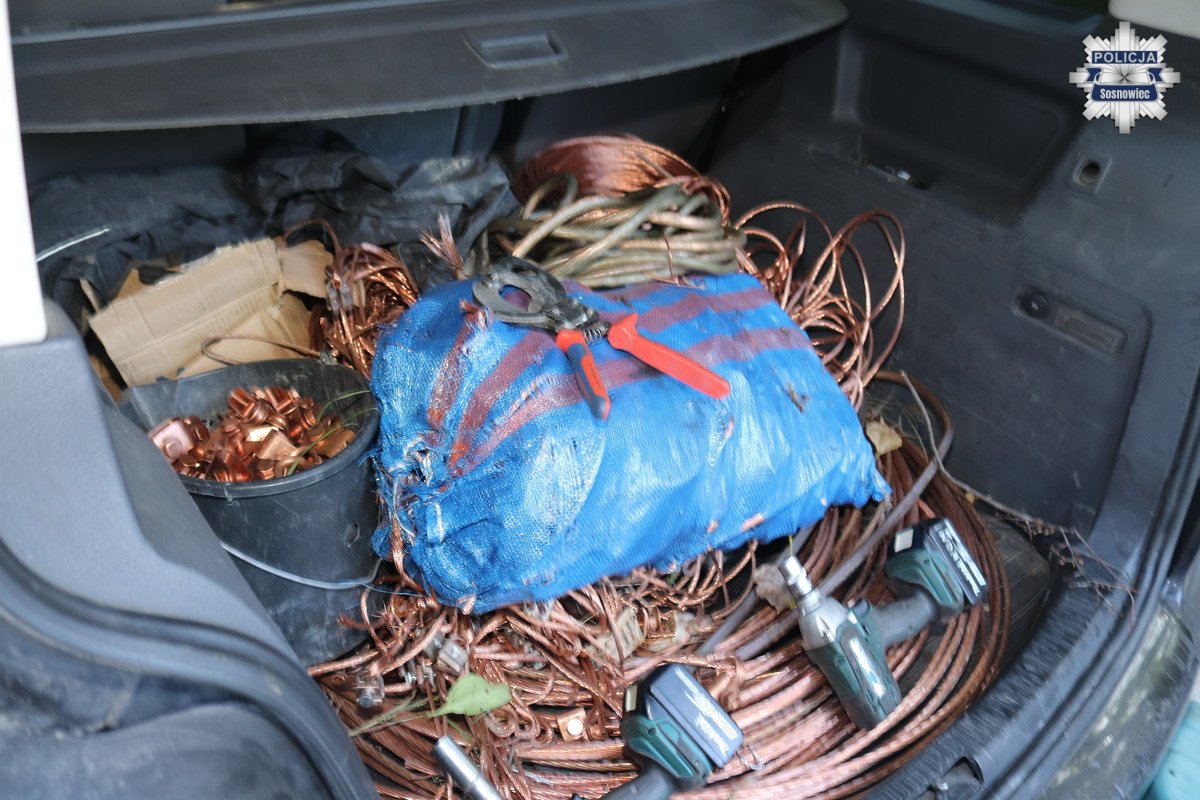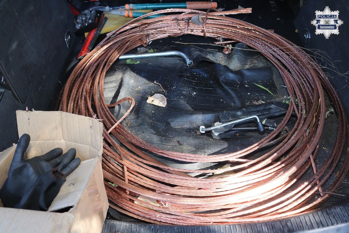 Kilka godzin po zgłoszeniach policjanci z Wydziału Kryminalnego Komendy Miejskiej Policji w Sosnowcu, patrolując ulicę Andersa, zwrócili uwagę na samochód marki Volkswagen, którego kierowca na widok radiowozu zaczął zachowywać się bardzo nerwowo. Mężczyzna przepakowywał z bagażnika różne przedmioty do drugiego auta – marki Audi. Okazało się, że był to 37-letni mieszkaniec Sosnowca. W samochodzie policjanci znaleźli miedziane liny trakcyjne oraz różnego rodzaju elektronarzędzia.