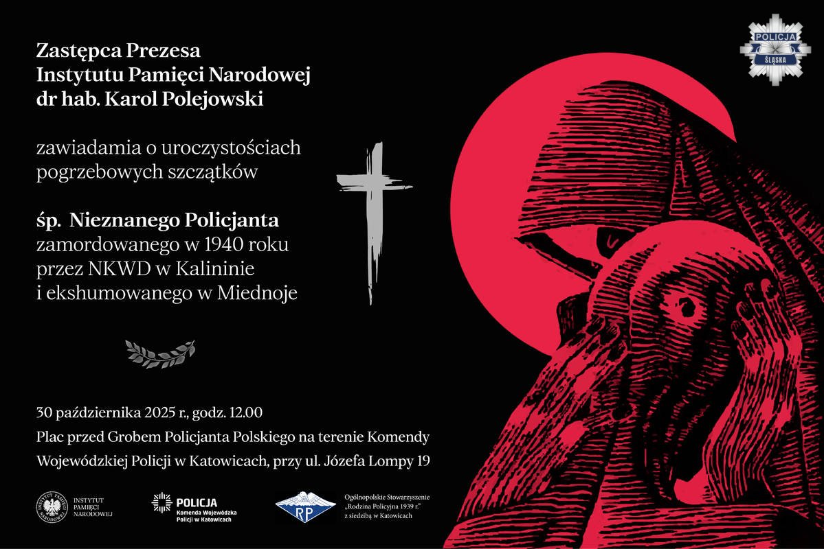 Komenda Wojewódzka Policji w Katowicach wspólnie z Ogólnopolskim Stowarzyszeniem Rodzina Policyjna 1939 r. oraz Instytutem Pamięci Narodowej zapraszają przedstawicieli mediów do udziału i relacjonowania uroczystości pogrzebowych szczątków śp. Nieznanego Policjanta, zamordowanego w 1940 roku przez NKWD w Kalininie i ekshumowanego w Miednoje.