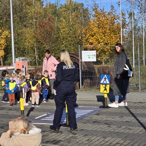 Podczas zajęć dzieci mogły w praktyce sprawdzić swoją wiedzę, korzystając z mobilnego miasteczka ruchu drogowego. Na specjalnie przygotowanym torze, wyposażonym w znaki drogowe, sygnalizację świetlną i przejścia dla pieszych, mali uczestnicy wcielali się w rolę pieszych. Dzięki zabawie uczyli się prawidłowych zachowań i utrwalali zasady bezpiecznego poruszania się po drogach.