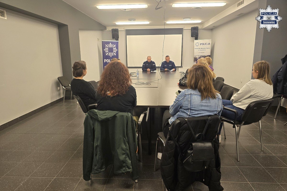 Pierwsze zajęcia rozpoczęli policjanci z Wydziału Prewencji Komendy Miejskiej Policji w Sosnowcu, którzy przywitali uczestniczki zapisane na kurs i przedstawili cel całego cyklu spotkań. W inauguracyjnym spotkaniu wzięła udział asp.szt. Danuta Adamek z Wydziału Psychologów Komendy Wojewódzkiej Policji w Katowicach. Pani psycholog poprowadziła wykład dotyczący psychologicznych aspektów samoobrony, w trakcie którego uczestniczki dowiedziały się, jak reagować w sytuacjach zagrożenia, jak opanować stres oraz jak rozpoznawać sygnały, które mogą świadczyć o niebezpieczeństwie.