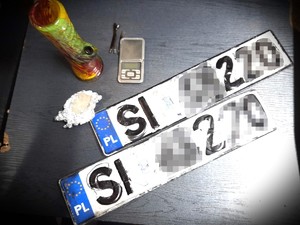 W trakcie kontroli pojazdu oraz przewożonego bagażu, mundurowi znaleźli zawinięte w folii aluminiowej białe, półprzeźroczyste kryształy oraz precyzyjną wagę, a także osmolone lufki i fajkę wodną. Dodatkowo w bagażniku policjanci natknęli się dwie tablice rejestracyjnych z naniesionym ręcznie napisem na oryginalnych wytłoczeniach, imitującym inne numery rejestracyjne.
