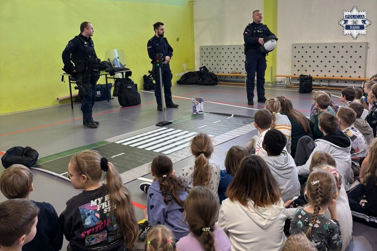 Specyfikę służby i rodzaje działań przybliżył mł. asp. Patryk Tame, sierż. Kamil Eljasiński i st. post. Marcin Koszczyk - policjanci z SPPP w Częstochowie. Podczas wizyty w Szkole Podstawowej nr 42 w Częstochowie policjanci przeprowadzili pogadane z uczniami najmłodszych klas.