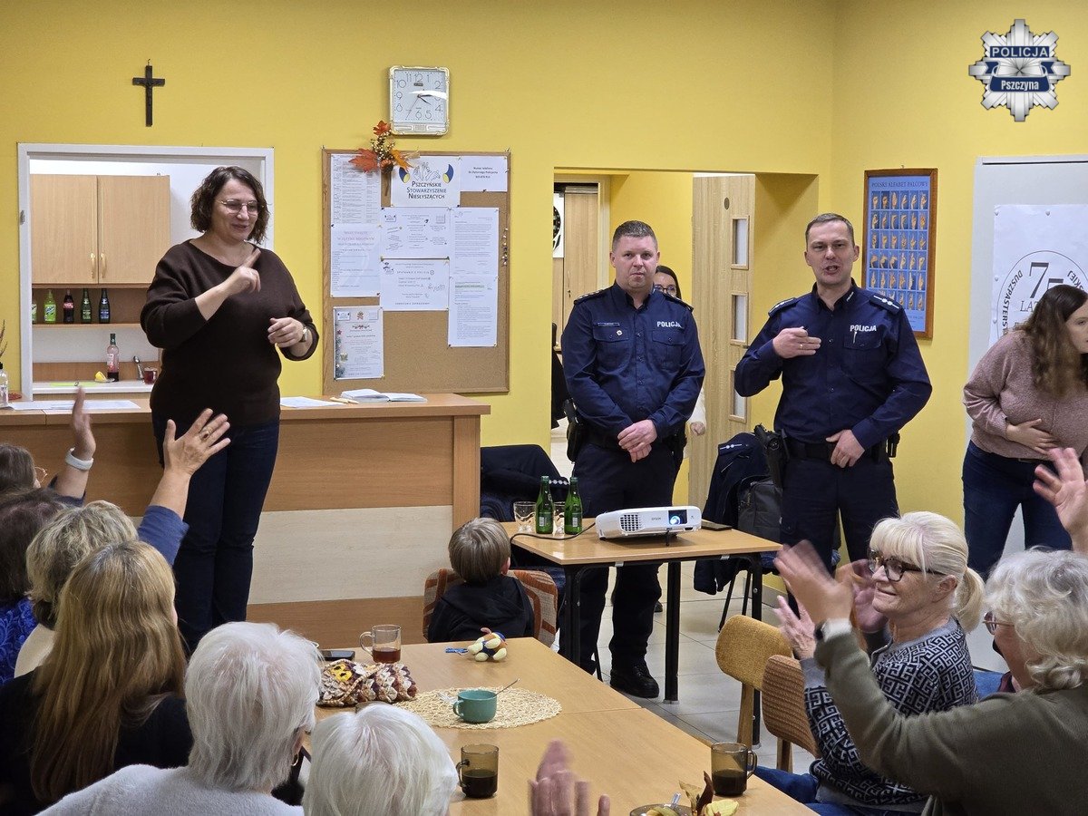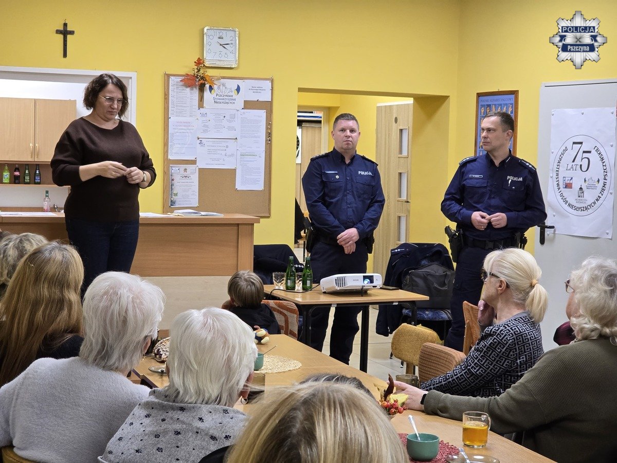 W ostatnich dniach stróże prawa przeprowadzili zajęcia profilaktyczne dla uczestników Pszczyńskiego Stowarzyszenia Niesłyszących. W spotkaniu wziął udział tłumacz języka migowego, co umożliwiło swobodną komunikację i pełne zaangażowanie wszystkich obecnych. Przedświąteczny termin wydarzenia nie był wybany przez mundurowych przypadkowo. To wyjątkowy czas, ale jest to również okres wzmożonej aktywności oszustów, którzy coraz częściej wykorzystują nasz pośpiech i nieuwagę.