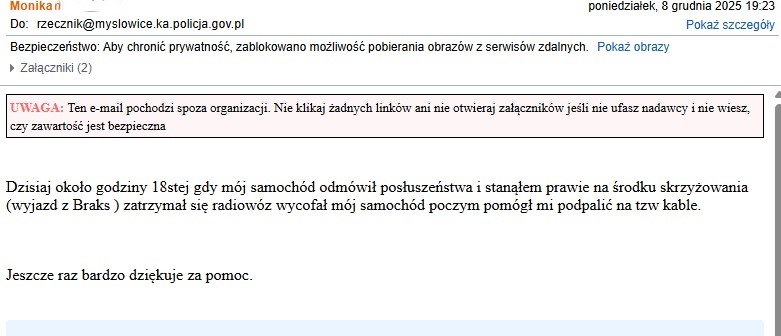 Na skrzynkę mailową Oficera Prasowego Komendy Miejskiej Policji w Mysłowicach wpłynęły podziękowania skierowane do policjantów z mysłowickiej drogówki, którzy pomogli kobiecie przy awarii jej samochodu.