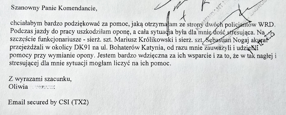 Do Komendanta Miejskiego Policji w Częstochowie mł. insp. Sławomira Zagrobelnego wpłynęły podziękowania dla policjantów z częstochowskiej drogówki: sierż. szt. Mariusza Królikowskiego i sierz. szt. Sebastiana Nogaj. W ten sposób Pani Oliwia chciała podziękować policjantom za pomoc przy wymianie koła w jej samochodzie, który uległ awarii. To już kolejny raz, kiedy częstochowscy mundurowi pokazują, że są gotowi nieść pomoc w każdej sytuacji.