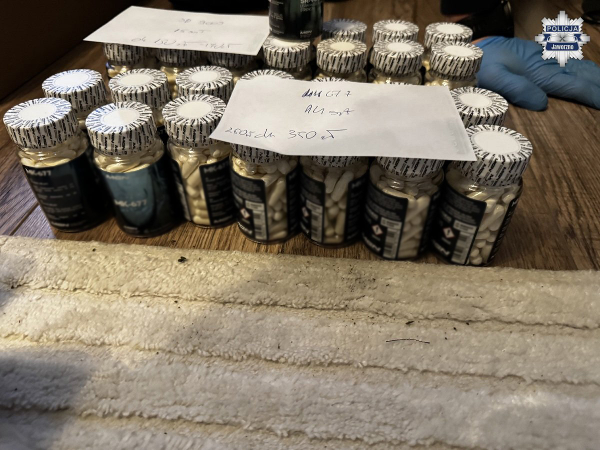 Podczas przeszukania mieszkania, piwnicy oraz wynajmowanego garażu mundurowi ujawnili i zabezpieczylu m.in. peptydy, hormony oraz substancje z grup S1 i S2, wymienione w załączniku nr 1 do Międzynarodowej Konwencji o zwalczaniu dopingu w sporcie, a także sfałszowane produkty lecznicze. Było to 1793 opakowań i fiolek z nielegalnymi substancjami z grupy S1,S2,S3 i S4. Policjanci zabezpieczyli również dokumentację handlową, faktury, potwierdzenia płatności, kasy i raporty fiskalne, naklejki z logo firmy, gotówkę w kwocie ponad 6 tysięcy złotych oraz inne dowody świadczące o prowadzeniu nielegalnej działalności, w tym sprzedaży poprzez paczkomaty na terenie kraju.
