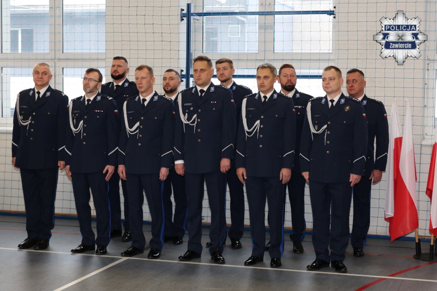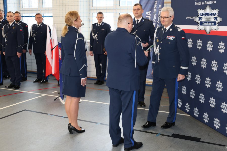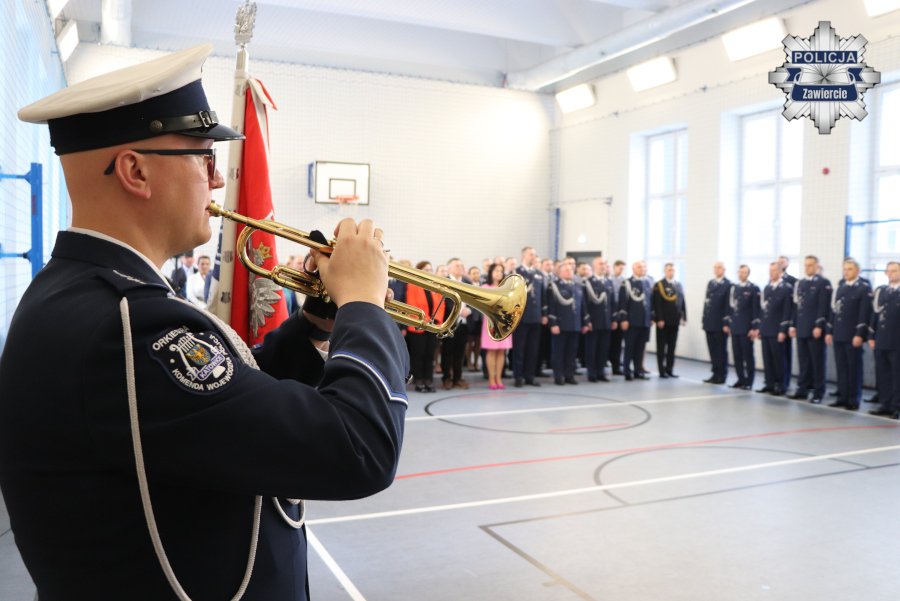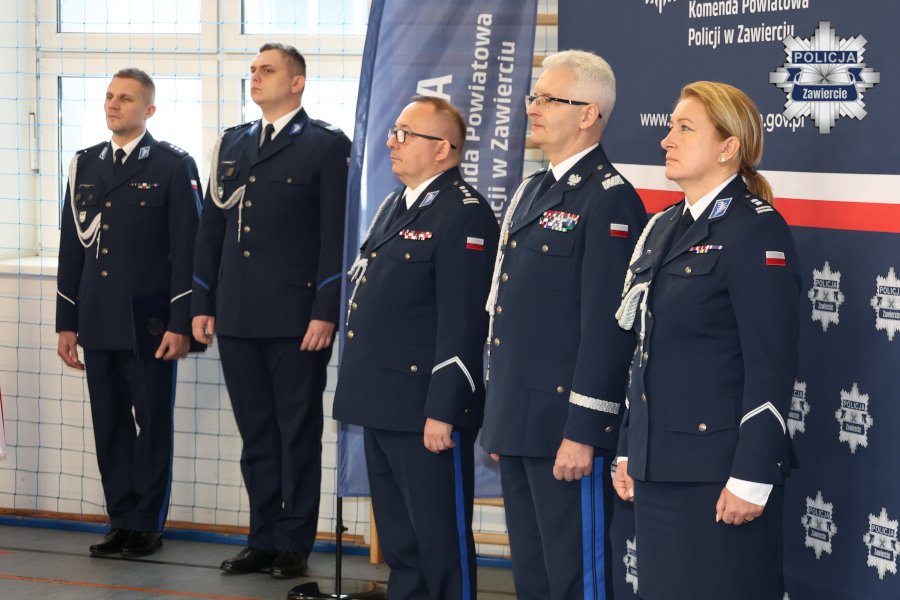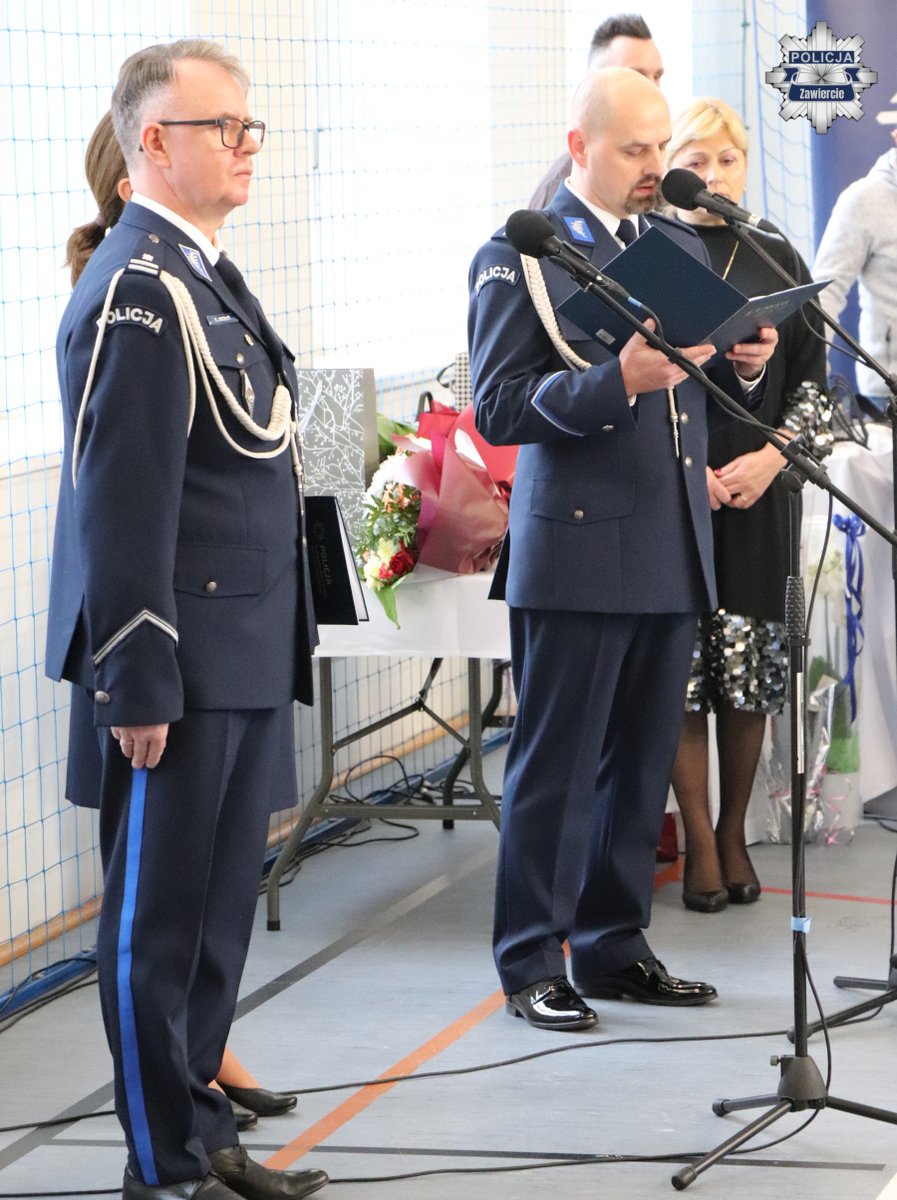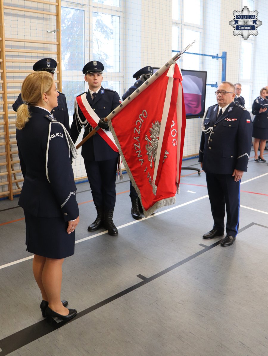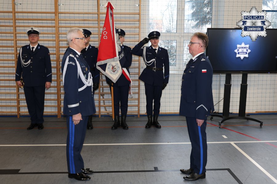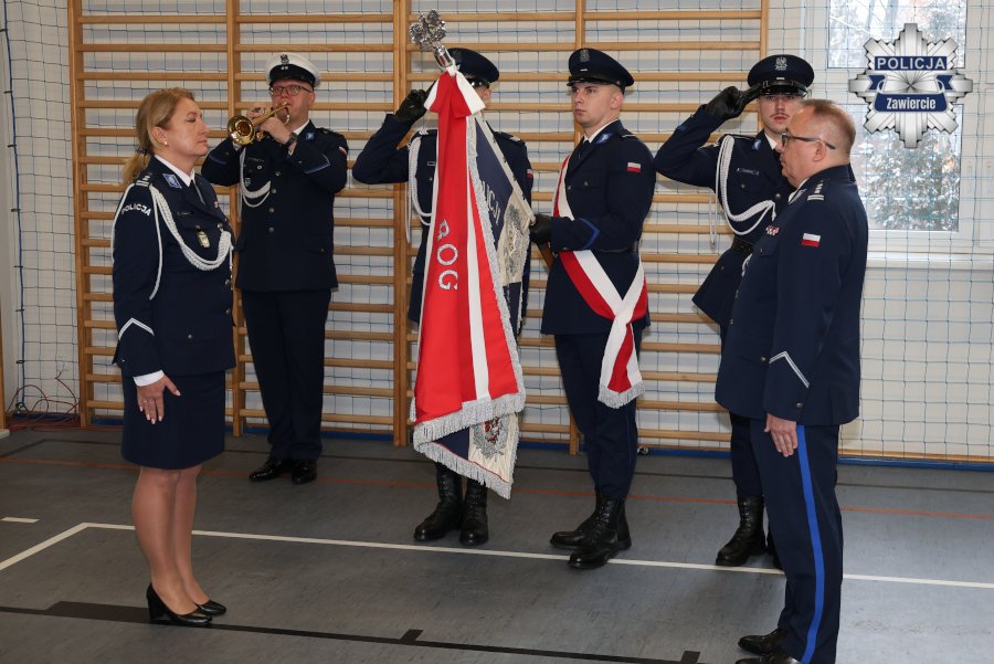 Po odczytaniu przez komisarza Marka Jona z Wydziału Gabinet Komendanta Wojewódzkiego Policji w Katowicach rozkazów personalnych nastąpiła ceremonia pożegnania i powitania ze sztandarem zawierciańskiej jednostki.