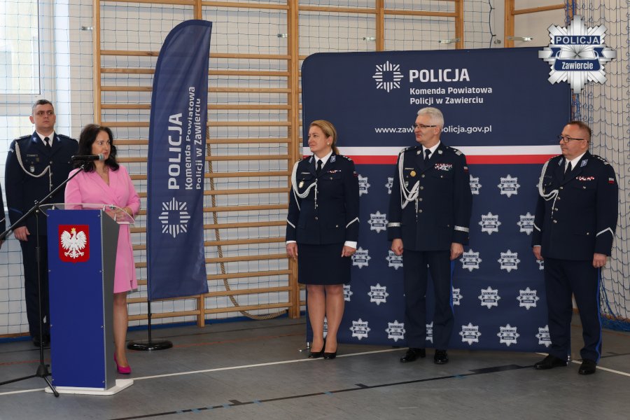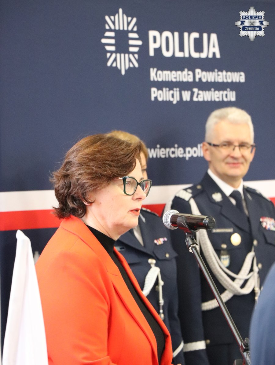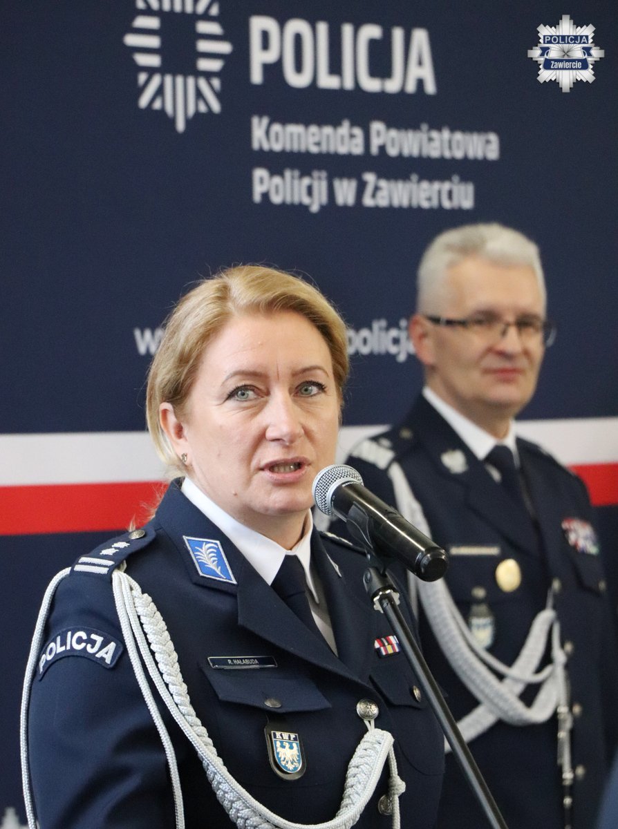 Młodszy inspektor Renata Hałabuda w swoim przemówieniu podziękowała Komendantowi Wojewódzkiemu Policji w Katowicach nadinspektorowi Mariuszowi Krzystyniakowi za zaufanie, którym ją obdarzył, powierzając zarządzanie zawierciańskim garnizonem. Wyraziła ogromną nadzieję, na kontynuację świetnej współpracy zarówno z samorządami, instytucjami, jak również z kadrą zawierciańskiej komendy i podległych jej jednostek.
