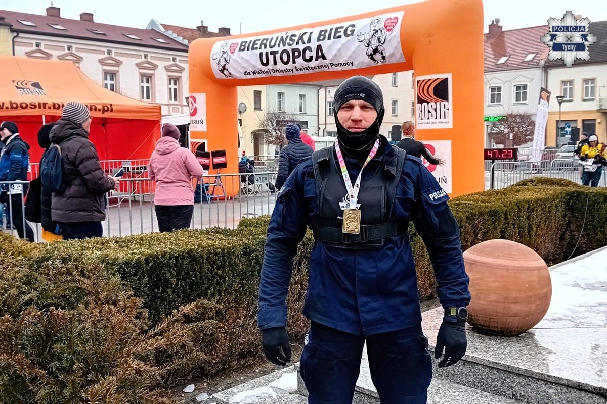 Policjant z Tychów w czołówce „Bieruńskiego Biegu Utopca” – sport, służba i pomoc dla WOŚP