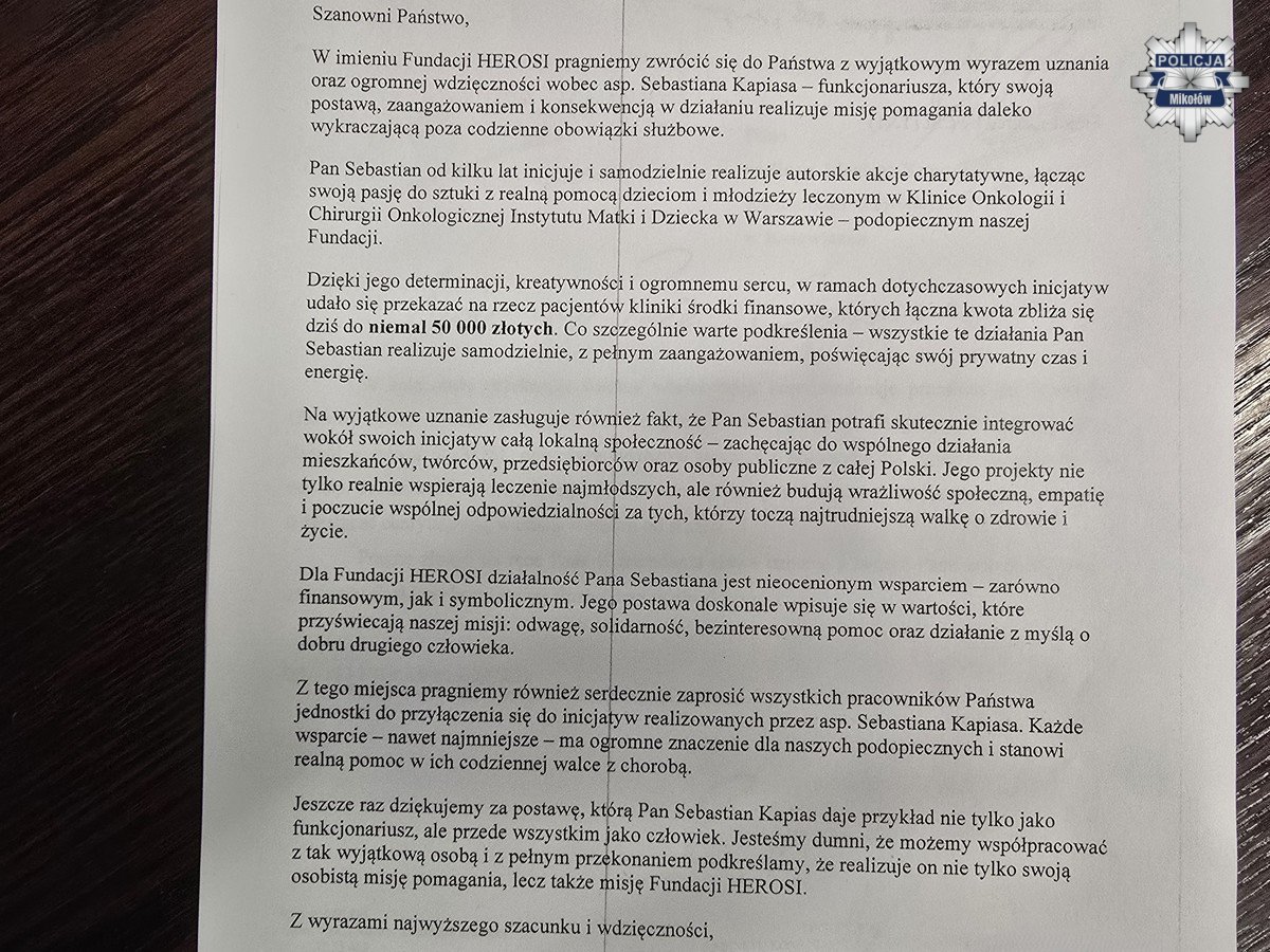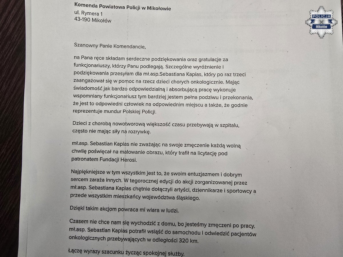 Do Komendy Powiatowej Policji w Mikołowie w ostatnim czasie wpłynęły dwa podziękowania dla policjanta mikołowskiej jednostki mł.asp. Sebastiana Kapiasa. Wspomniany funkcjonariusz pracuje w Komendzie Powiatowej Policji w Mikołowie na stanowisku koordynatora Zespołu ds. Profilaktyki Społecznej. W swojej pracy codziennie ma styczność z ludźmi, od dzieci w wieku przedszkolnym po seniorów. Policjant ma wiele pasji, od sztuk walki po malowanie, rysowanie i pomaganie. W wolnym czasie od lat udziela się charytatywnie m.in. w Fundacji Herosi i Kliniki Onkologii i Chirurgii Onkologicznej Dzieci i Młodzieży w Warszawie.
