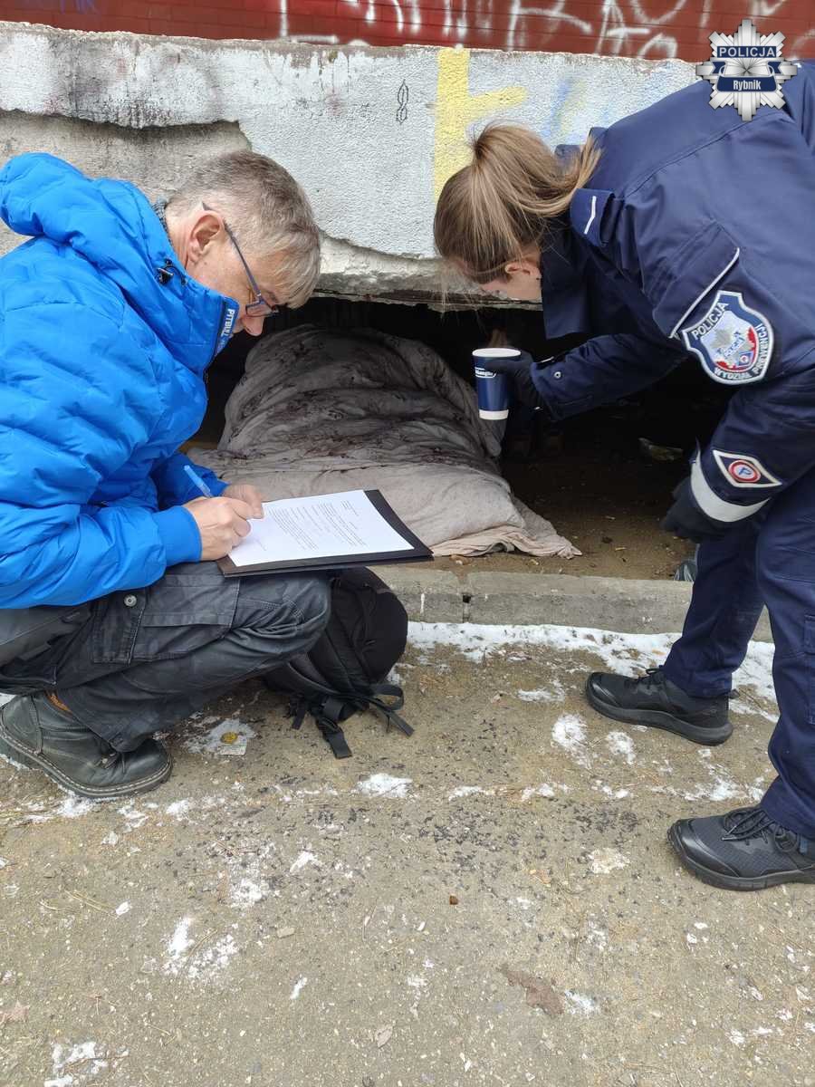 Każdego dnia policjanci pomagają osobom bezdomnym. Tym razem rybniccy stróże prawa wraz ze streetworkerem z miejscowego ośrodka pomocy społecznej, czyli osobą która zajmuje się udzielaniem pomocy i wsparcia osobom znajdującym się w kryzysie bezdomności bezpośrednio w miejscu ich przebywania, podczas cyklicznych kontroli sprawdzili miejsca, gdzie przebywają osoby, które utraciły dach nad głową. Kiedy na zewnątrz panują niskie temperatury, wiele osób narażonych jest na utratę życia lub zdrowia na skutek wychłodzenia organizmu. Problem ten dotyka przede wszystkim osób bezdomnych, samotnych i w podeszłym wieku. Zagrożenie takie dotyczy także osób będących pod wpływem alkoholu. Nie bądźmy obojętni i alarmujmy Policję za każdym razem, kiedy ktoś jest narażony na utratę życia lub zdrowia. Wystarczy jeden telefon pod numer alarmowy, aby uratować inną osobę.