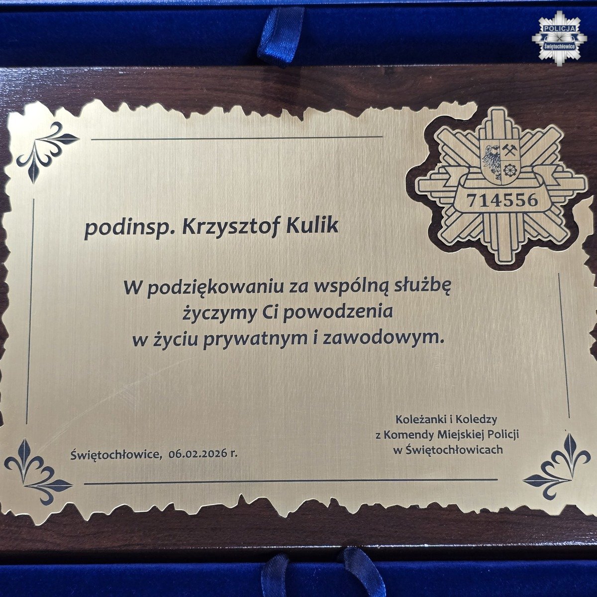 Z mundurem żegna się po ponad 30 latach nienagannej służby, w trakcie której zawsze dbał o rozwój własny i podnoszenie kwalifikacji, był wielokrotnie nagradzany i wyróżniany oraz uhonorowany Brązową Odznaką „Zasłużony Policjant” oraz wczoraj- odznaką honorową "Za zasługi dla Komendy Wojewódzkiej Policji w Katowicach".