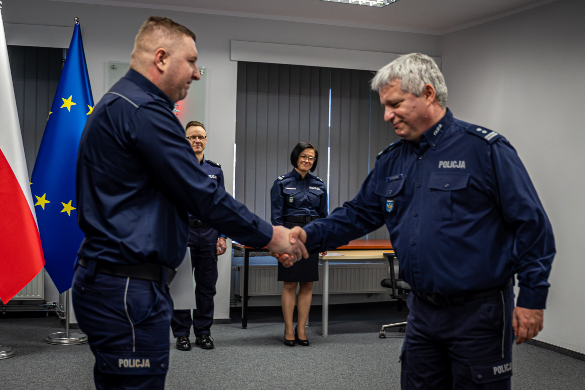 Szef śląskich policjantów - nadinspektor Mariusz Krzystyniak, w towarzystwie swojego zastępcy - młodszego inspektora Marka Gadzińskiego, wręczył komisarzowi Mateuszowi Juraszkowi rozkaz o czasowym powierzeniu obowiązków na stanowisku Zastępcy Naczelnika Wydziału Zaopatrzenia KWP w Katowicach. Przed objęciem obecnego stanowiska, realizował on zadania eksperta tego wydziału. W spotkaniu uczestniczył również młodszy inspektror Sebastian Wróbel - Naczelnik Wydziału Zaopatrzenia KWP w Katowicach.