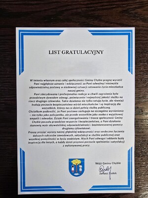 Na ręce Komendanta Powiatowego Policji w Mikołowie wpłynęło podziękowanie od Wójta Gminy Chybie dla mikołowskiej policjantki. Funkcjonariuszka w czasie wolnym od służby udzieliła pomocy mężczyźnie, który podczas uroczystości stracił przytomność i przestał oddychać. Pomoc policjantki oraz innych osób okazała się profesjonalna i skuteczna.