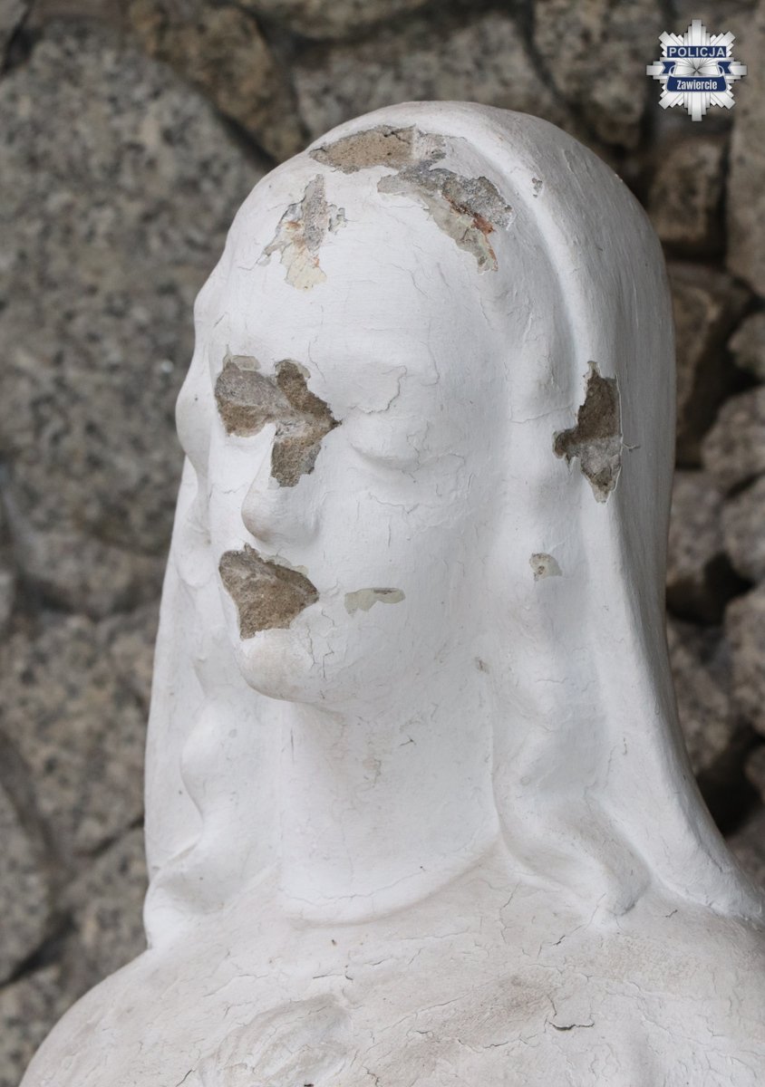 Gdy policjanci potwierdzili uszkodzenie dwóch figur, natychmiast ruszyli w teren na poszukiwania opisanego przez księdza sprawcy. Patrolując Porębę, w rejonie ulicy Wojska Polskiego, zauważyli znanego im mężczyznę, który na widok radiowozu zaczął się nerwowo zachowywać i oddalać w przeciwnym kierunku. Po chwili został zatrzymany. 27-latek przyznał, że to on zniszczył figury. Wskazał też miejsce, gdzie zostawił siekierę, którą zabezpieczyli policjanci. Badanie trzeźwości wykazało, że miał on w organizmie ponad 0,5 promila alkoholu. Mężczyzna trafił do policyjnego aresztu.