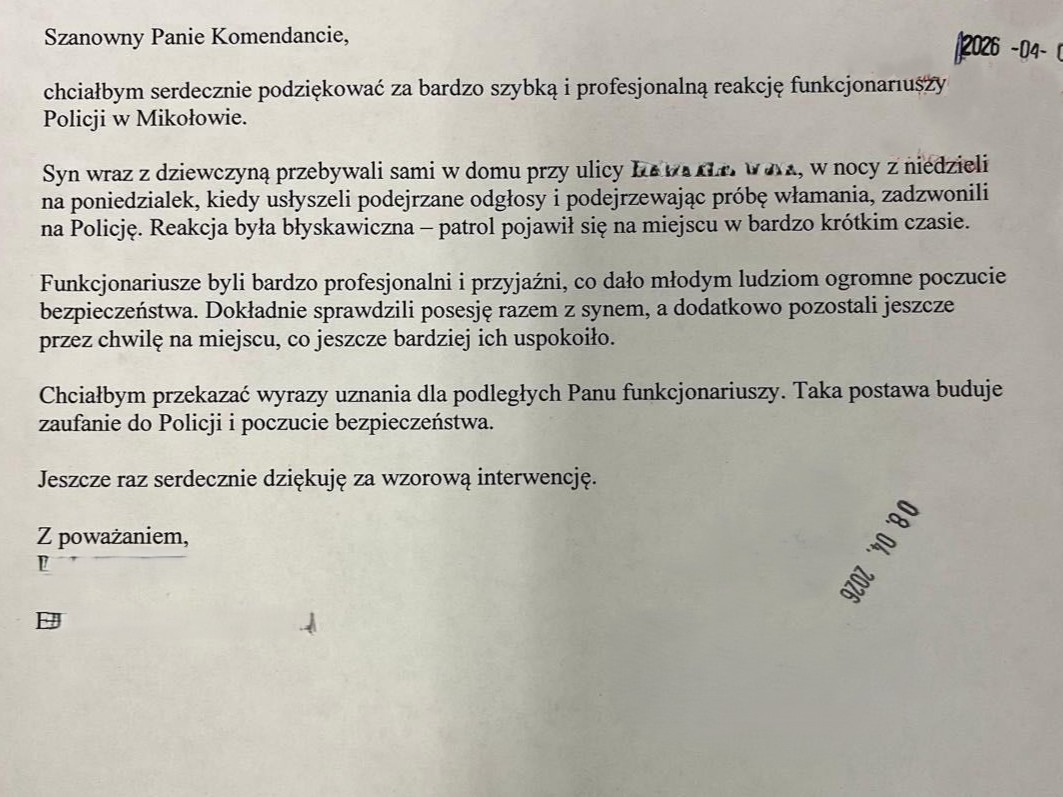 Do Komendanta Powiatowego Policji w Mikołowie wpłynęły podziękowania od jednego z mieszkańców naszego powiatu dla mikołowskich policjantów. Funkcjonariusze wykonywali swoje ustawowe obowiązki, jednak cieszymy się, że mogliśmy pomóc i dzięki naszej służbie mieszkańcy powiatu mikołowskiego czują się bezpieczniej.