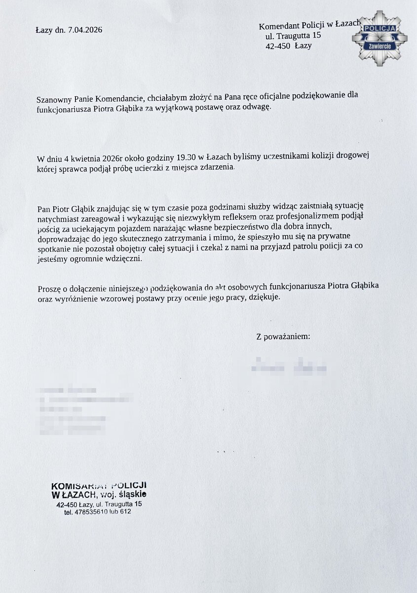 Na ręce Komendanta Komisariatu Policji w Łazach, wpłynęły podziękowania. Mieszkanka Łaz wyraziła swoją wdzięczność dzielnicowemu sierżantowi sztabowemu Piotrowi Głąbikowi, który będąc poza służbą, zaangażował się w zatrzymanie sprawcy kolizji. Słowa uznania mieszkańców są ogromnie budujące i dla każdego policjanta niezwykle cenne.