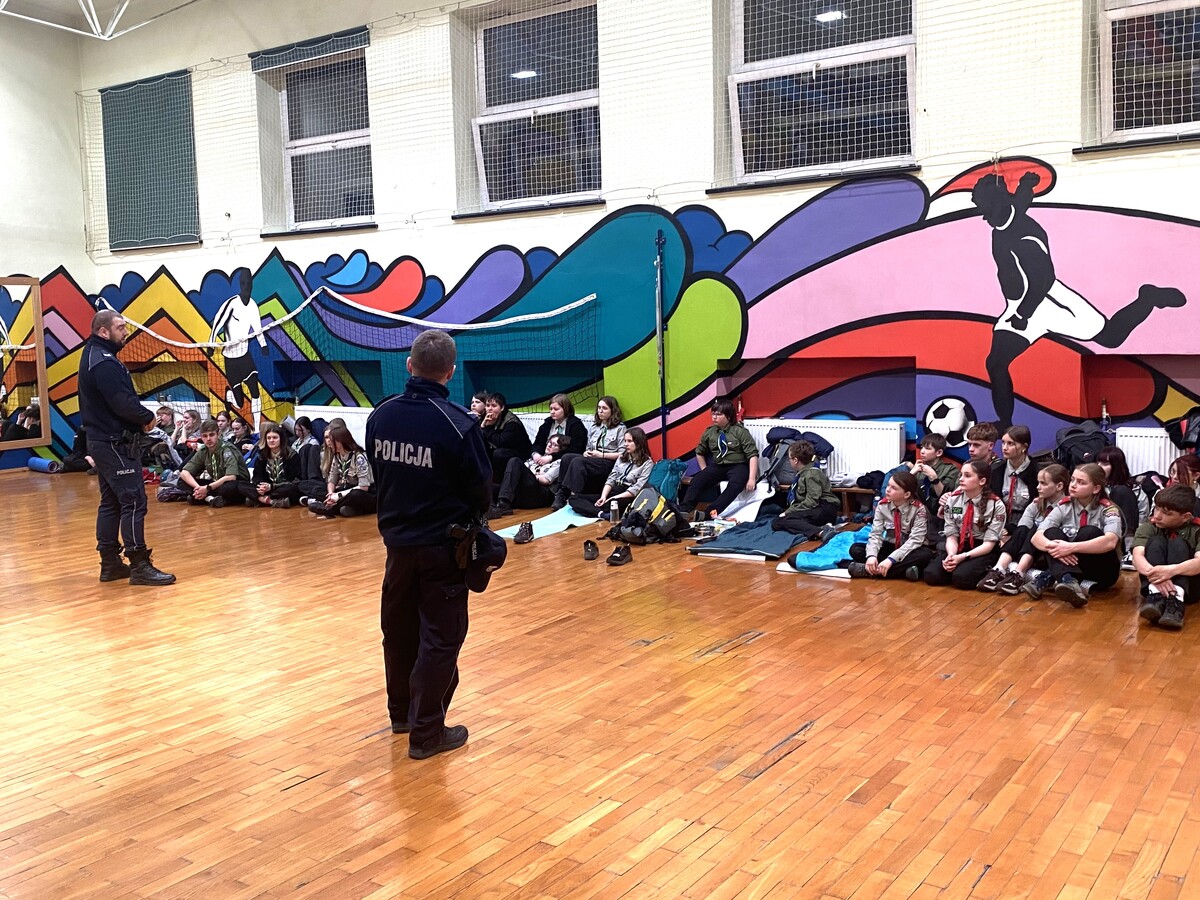 Policjant dzielnicowy - sierżant sztabowy Karol Czarnota, wspólnie z dzielnicowym - sierżantem Dawidem Pawełczykiem w trakcie spotkania omówili zasady bezpiecznego poruszania się po drogach publicznych. Zwracając przy tym szczególną uwagę na widoczność uczestników, przede wszystkim po zmroku lub w warunkach ograniczonej widoczności. Harcerze dowiedzieli się również, jak odpowiedzialnie zachowywać się podczas gier i zabaw organizowanych w terenie leśnym.