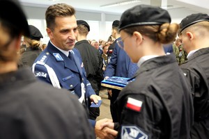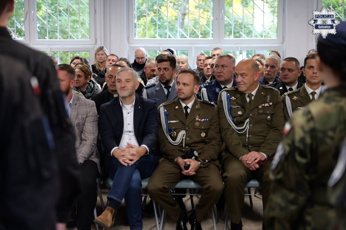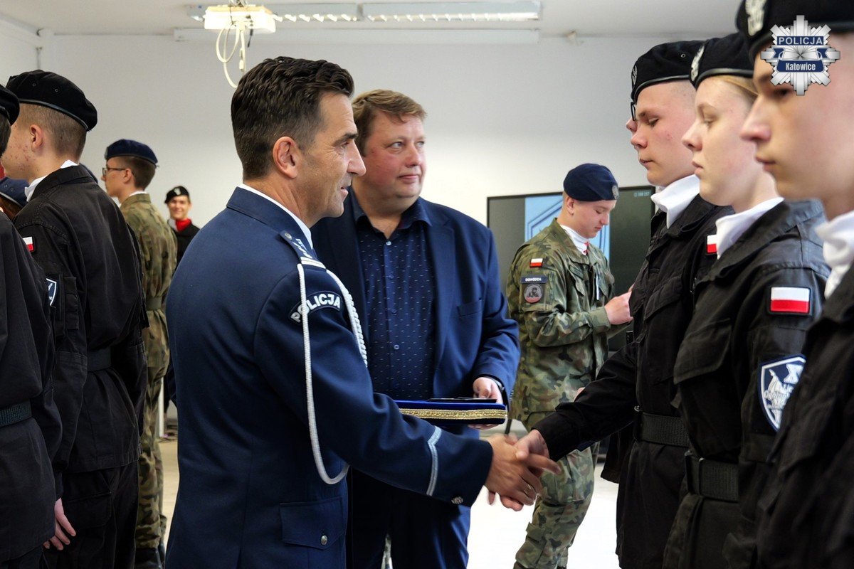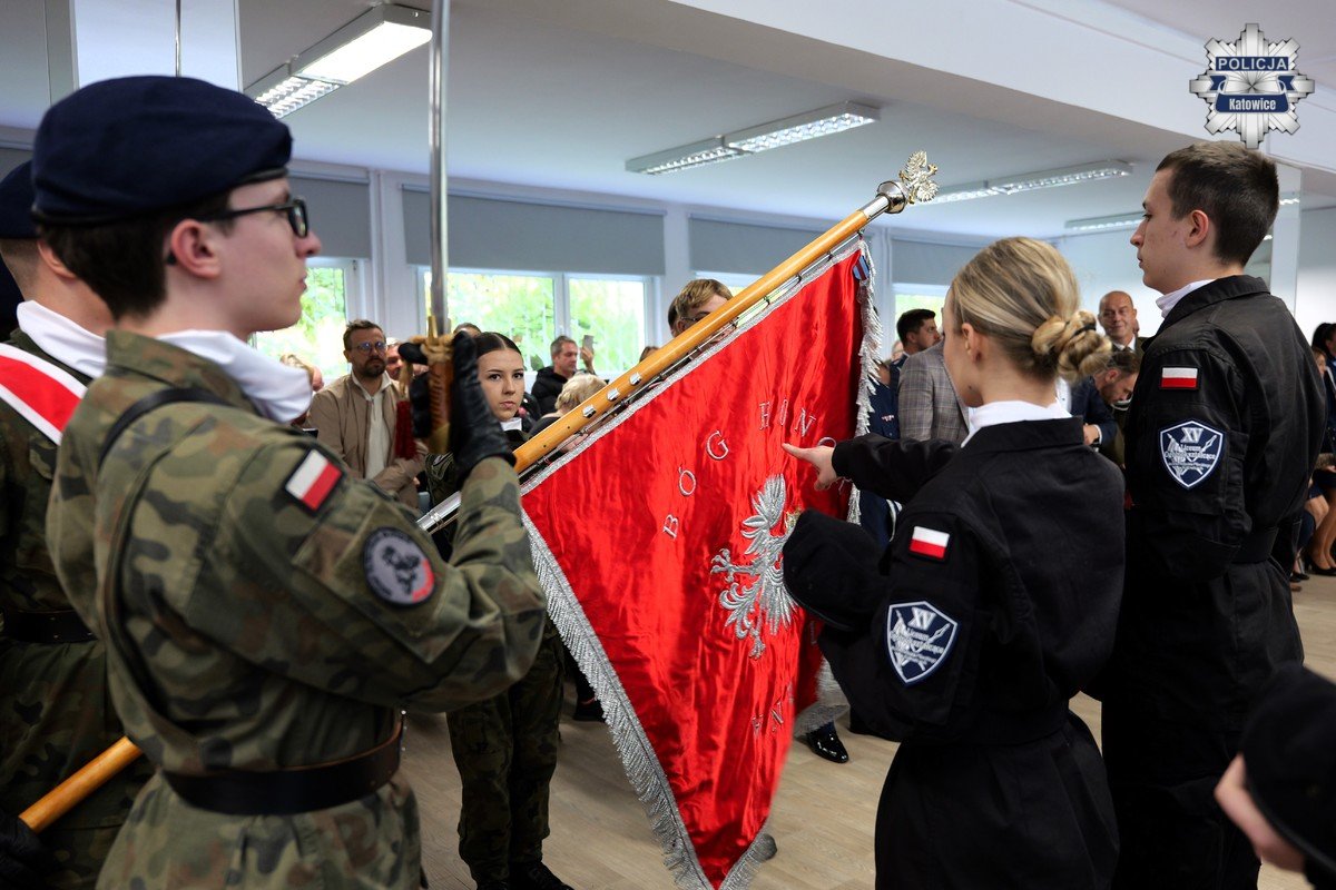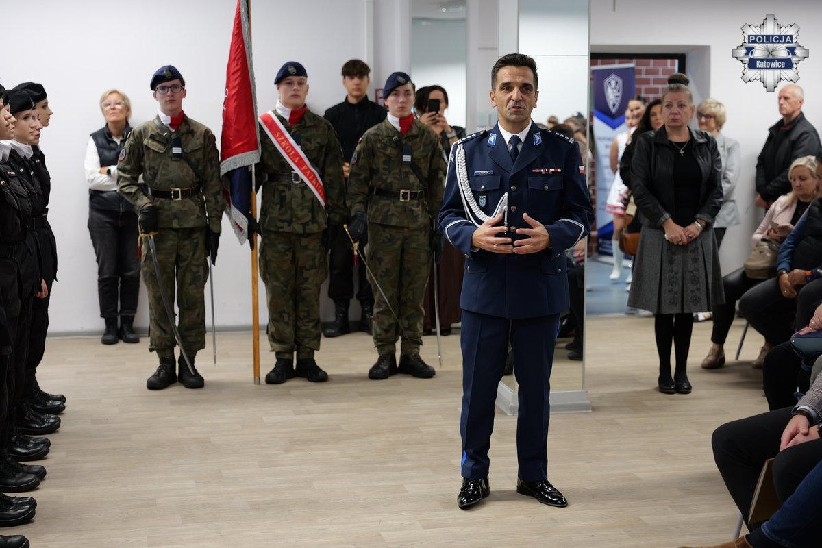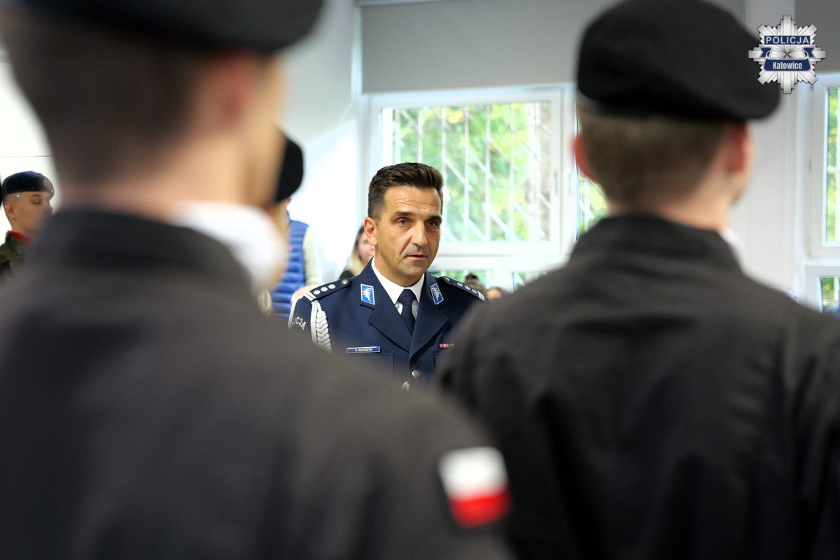 Następnie szef katowickich policjantów zabrał głos i pogratulował uczniom decyzji o nauce w klasach mundurowych, życząc im powodzenia i wytrwałości. Zaznaczył, że już za kilka lat będą mogli zmienić szkolny mundur, na niebieski mundur policyjny i dołączyć do szeregów Policji, która oferuje szerokie możliwości rozwoju zawodowego. Komendant zapewnił także o stałym wsparciu Komendy Miejskiej Policji w Katowicach w działaniach na rzecz uczniów i szkoły.
