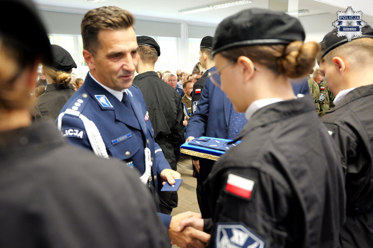 Po złożeniu ślubowania Komendant Miejski Policji w Katowicach insp. Dariusz Kiedrzyn, wręczył pierwszoklasistom pagon Młodszego Kadeta – pierwszy szkolny stopień.