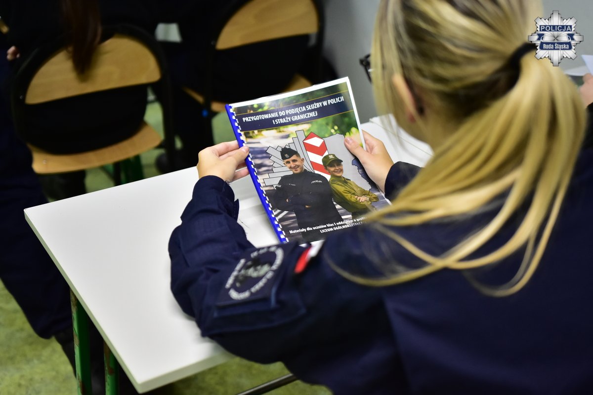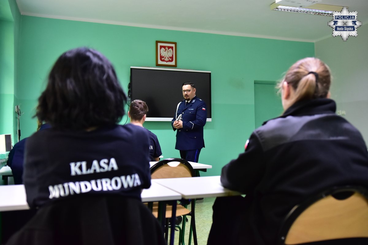 Podkomisarz Szymon Wolf z rudzkiej komendy jako jeden z policjantów prowadzi zajęcia z uczniami oddziału o profilu mundurowym w IV Liceum Ogólnokształcącym w rudzkim Orzegowie. Zgodnie z harmonogramem zaplanowanym na rok szkolny 2025/2026, w ramach zawartego porozumienia, policjanci przedstawiają młodzieży specyfikę służby w naszej formacji oraz omawiają zadania Policji w zakresie bezpieczeństwa i porządku publicznego.