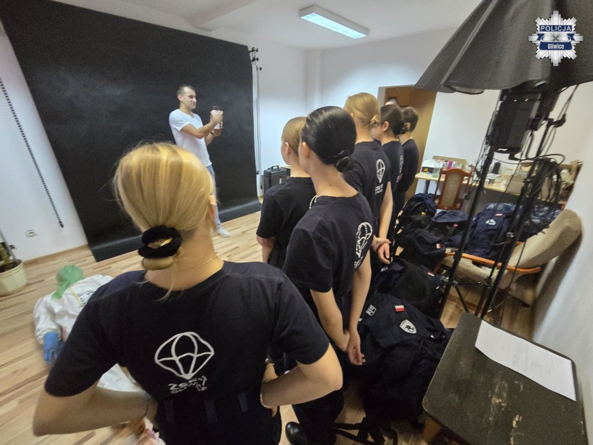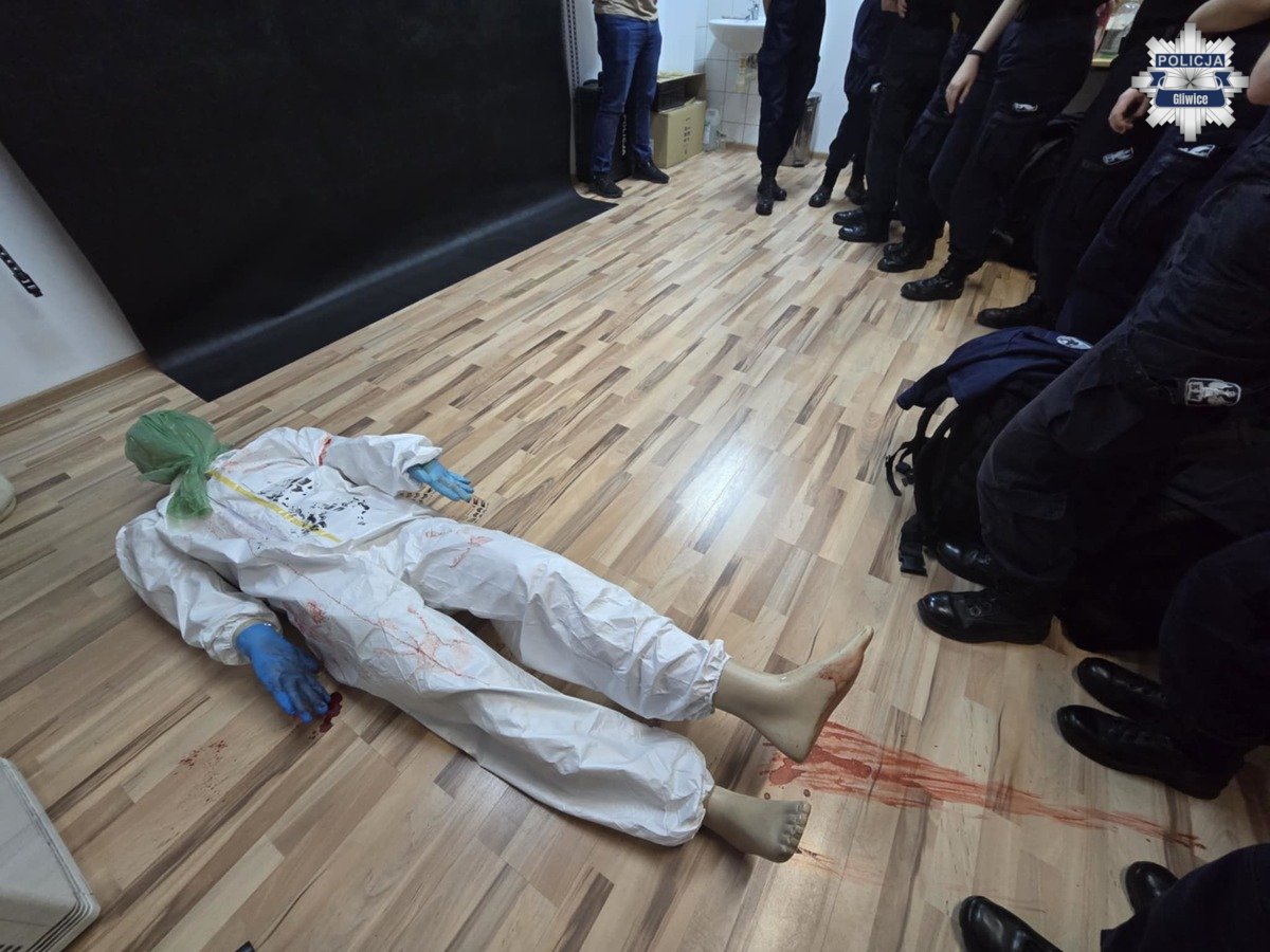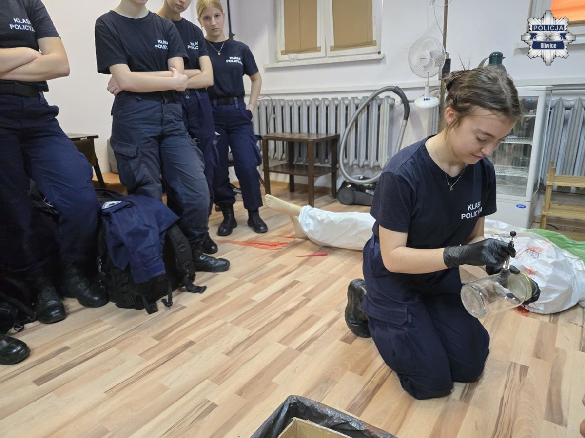 • Zajęcia dla uczniów klasy policyjnej prowadzi technik kryminalistyki. Dookoła niego w pokoju stoją uczniowie. Na podłoże leży manekin symulujący ofiarę.
