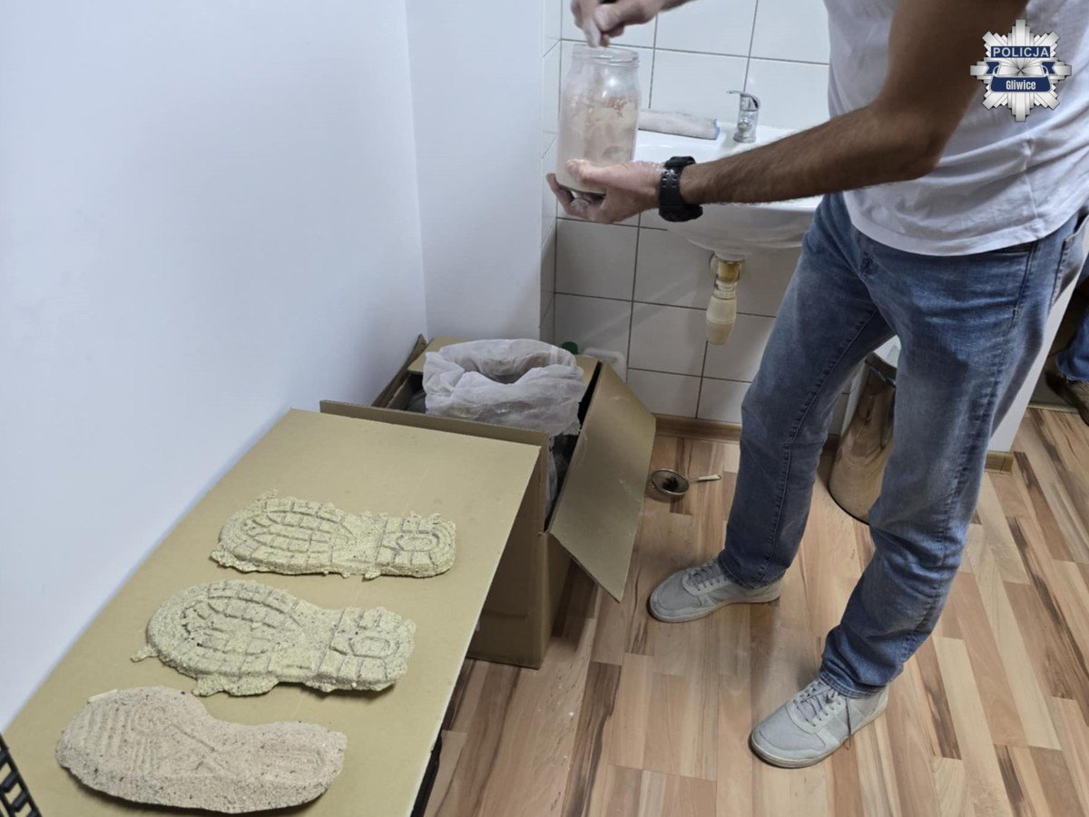 • Zajęcia dla uczniów klasy policyjnej prowadzi technik kryminalistyki. Na szafce leżą pobrane ślady butów