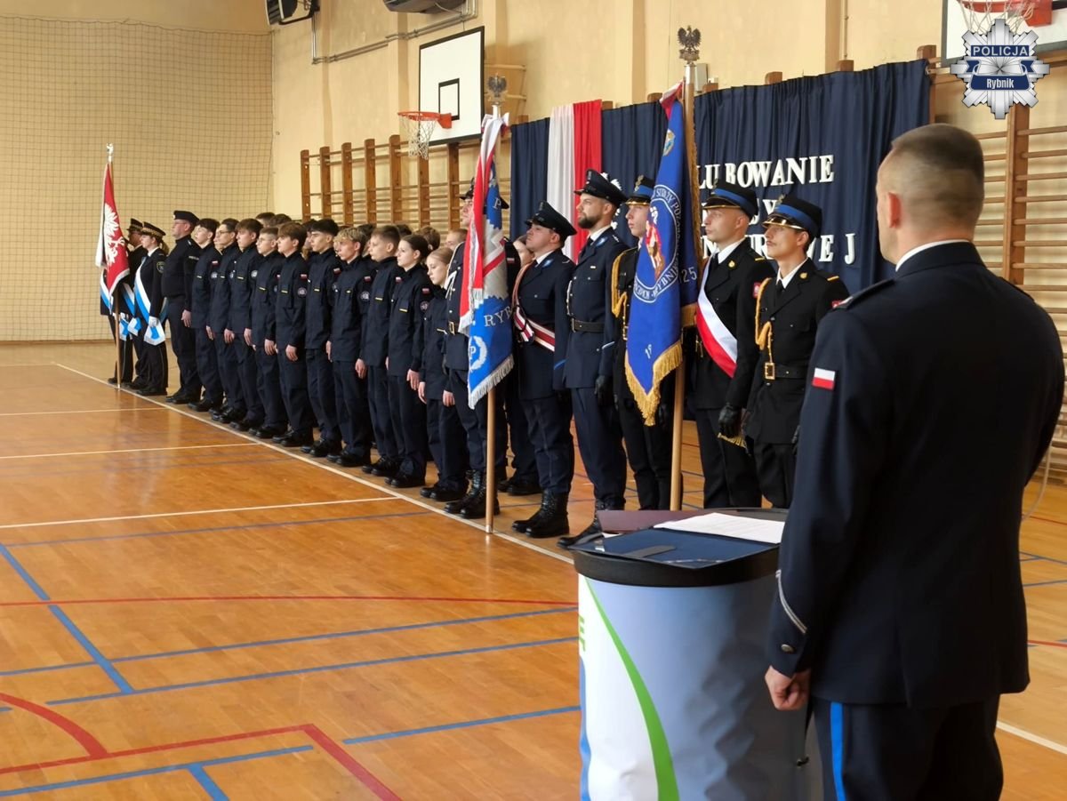 Dowódcą uroczystej zbiórki był Naczelnik Wydziału Prewencji rybnickiej jednostki - aspirant sztabowy Arkadiusz Ryznar. Naszą komendę reprezentowała rónież podkomisarz Barbara Klamecka — Ekspert Zespołu Kadr i Szkolenia, a młodych kadetów do ślubowania poprowadził: młodszy aspirant Paweł Grochla.