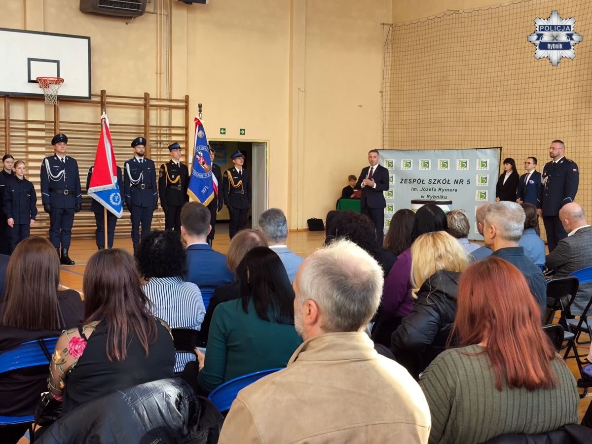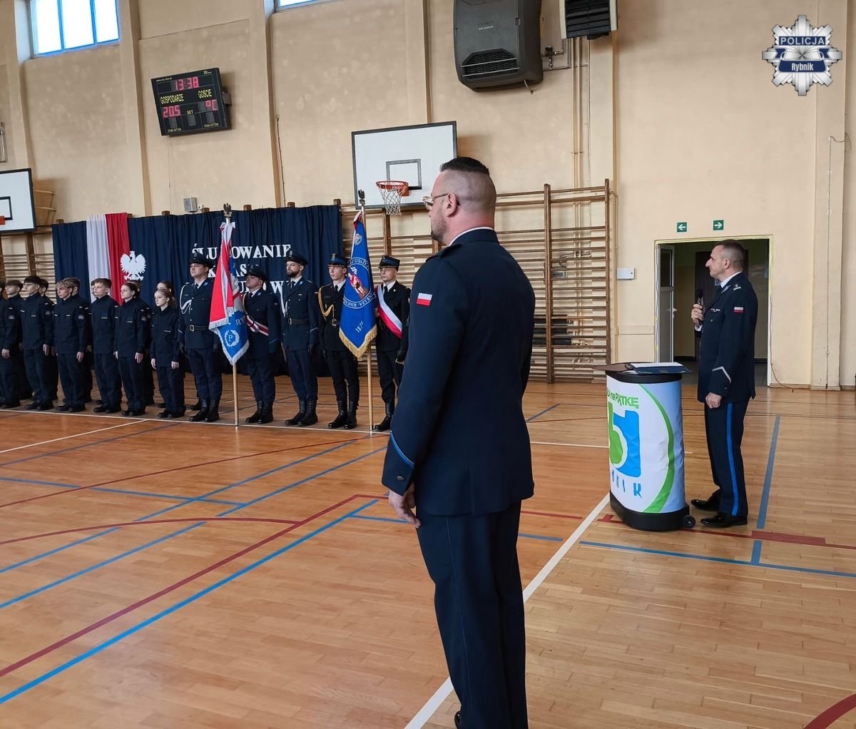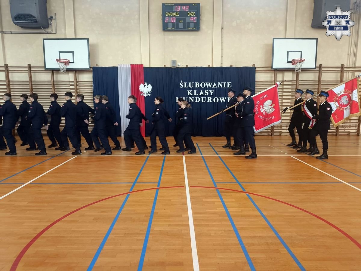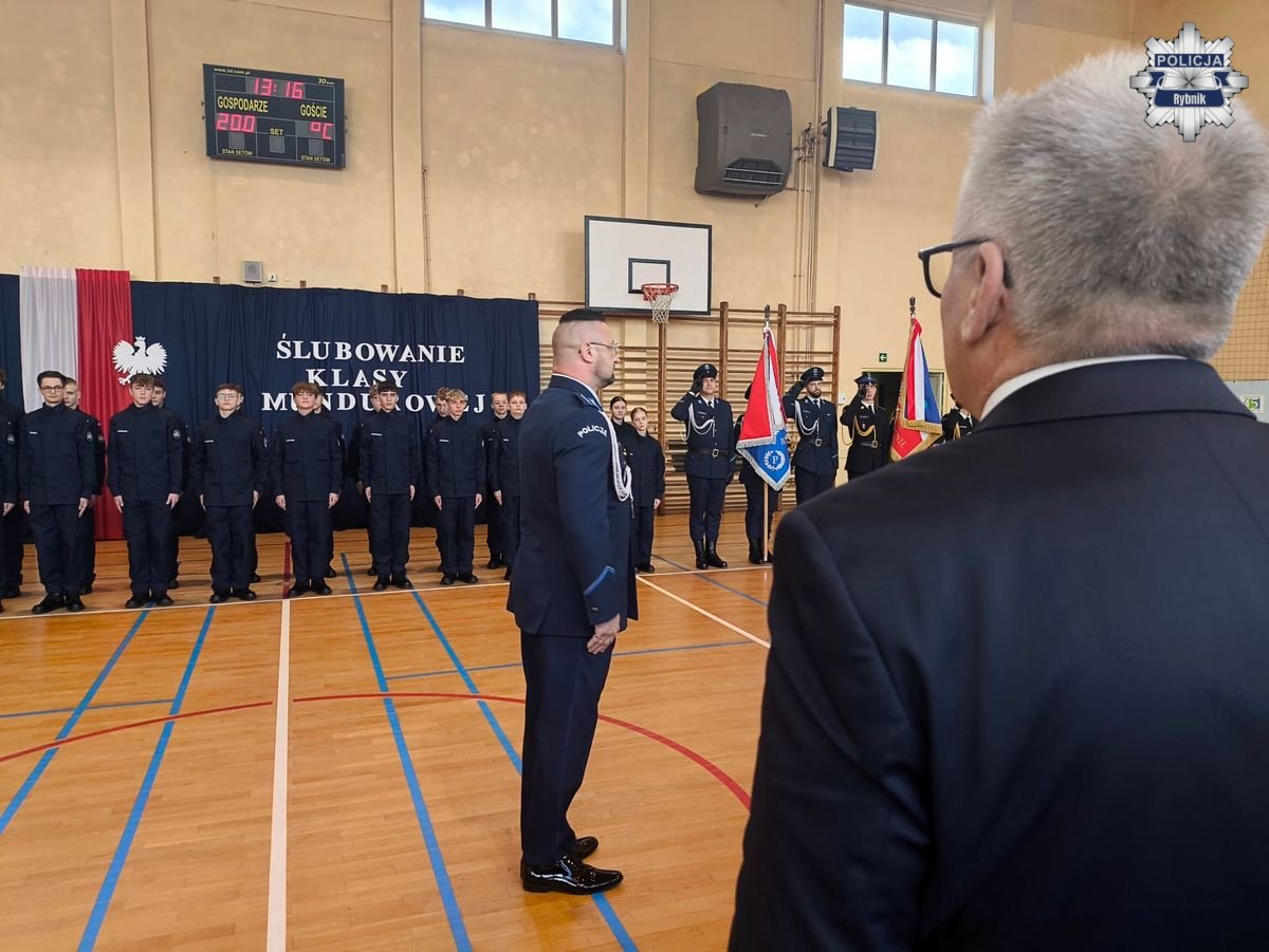 Rybnicką komendę reprezentował mł. insp. Krzysztof Piontek, Zastępca Komendanta Miejskiego Policji w Rybniku, który w swoim przemówieniu zaznaczył, jak ważny krok w stronę przyszłej służby stanowi ślubowanie. Pan Komendant dodał, że wybierając szkołę mundurową, uczniowie podjęli ważną decyzję. To pierwszy krok ku służbie, która wymaga hartu ducha, zaangażowania, empatii i gotowości do niesienia pomocy innym. Szczególnie mocno wybrzmiały jego słowa policjanta o istocie munduru, który oznacza autorytet, zaufanie społeczne i ciężar obowiązku wobec drugiego człowieka.