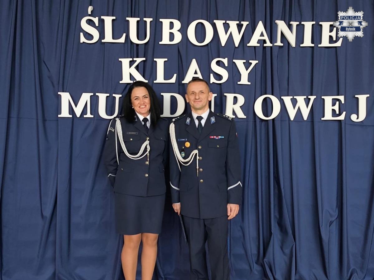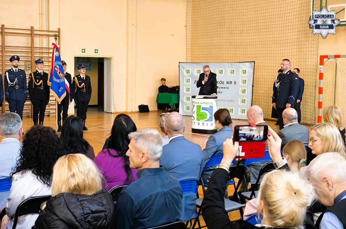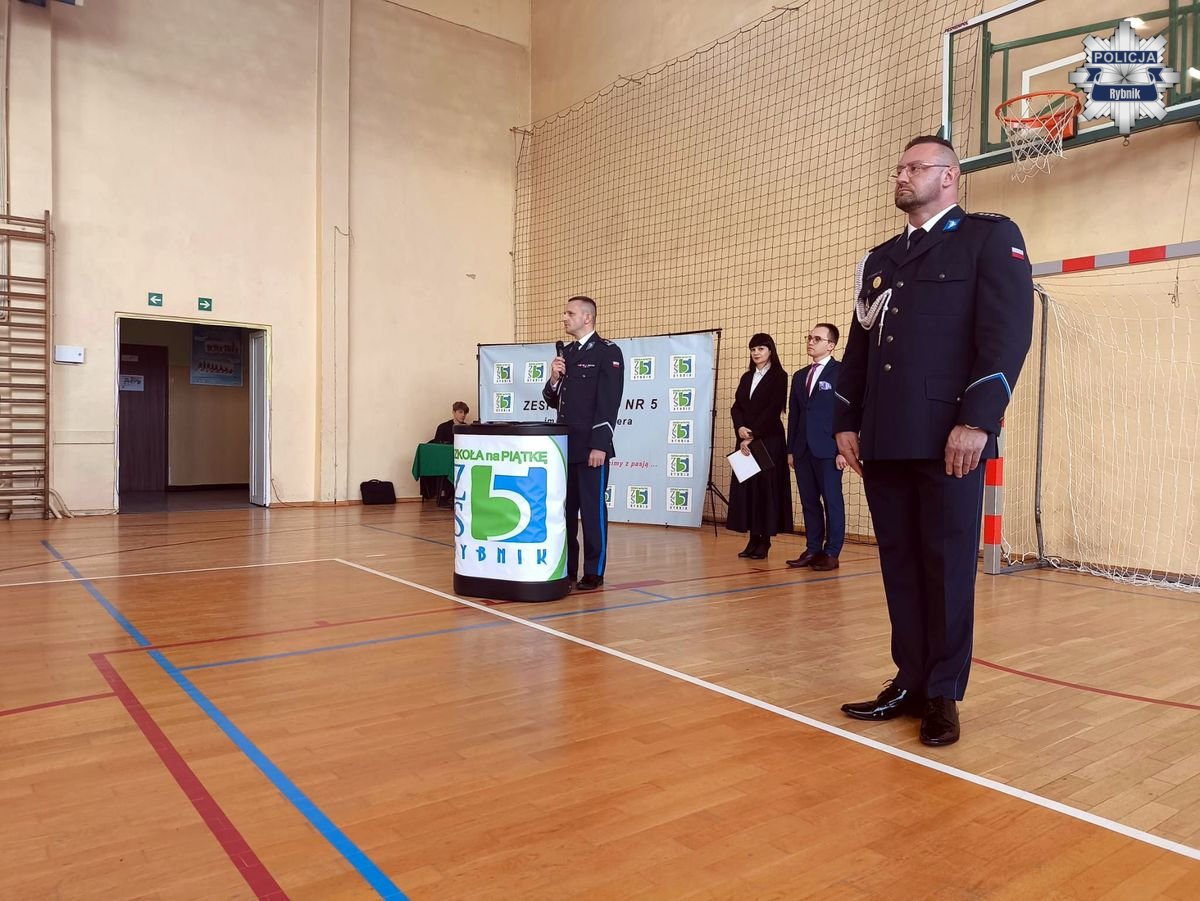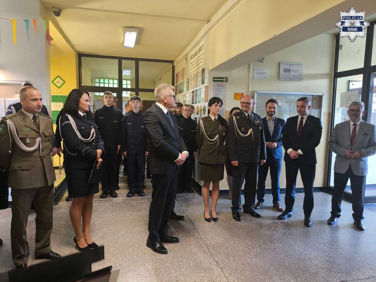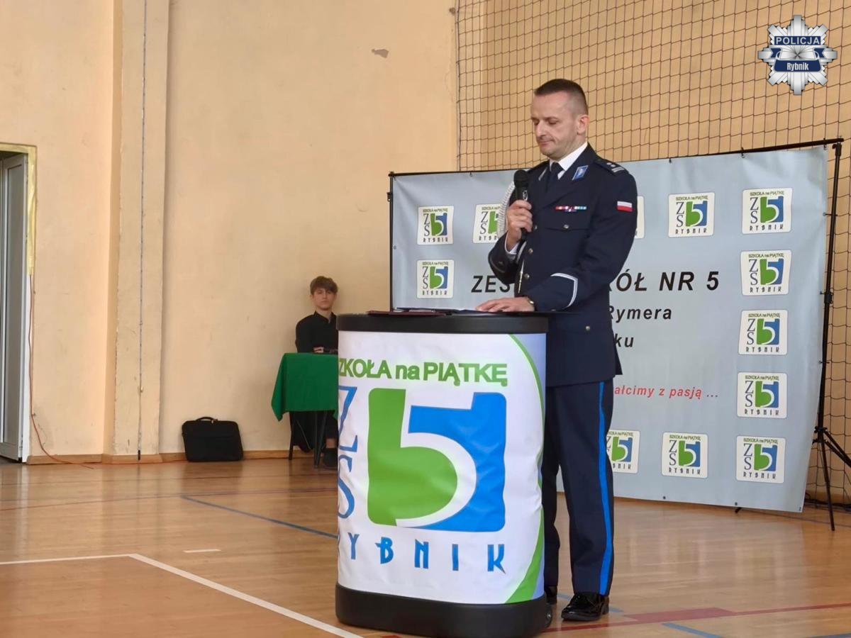 Rybnicką komendę reprezentował mł. insp. Krzysztof Piontek, Zastępca Komendanta Miejskiego Policji w Rybniku, który w swoim przemówieniu zaznaczył, jak ważny krok w stronę przyszłej służby stanowi ślubowanie. Pan Komendant dodał, że wybierając szkołę mundurową, uczniowie podjęli ważną decyzję. To pierwszy krok ku służbie, która wymaga hartu ducha, zaangażowania, empatii i gotowości do niesienia pomocy innym. Szczególnie mocno wybrzmiały jego słowa policjanta o istocie munduru, który oznacza autorytet, zaufanie społeczne i ciężar obowiązku wobec drugiego człowieka.