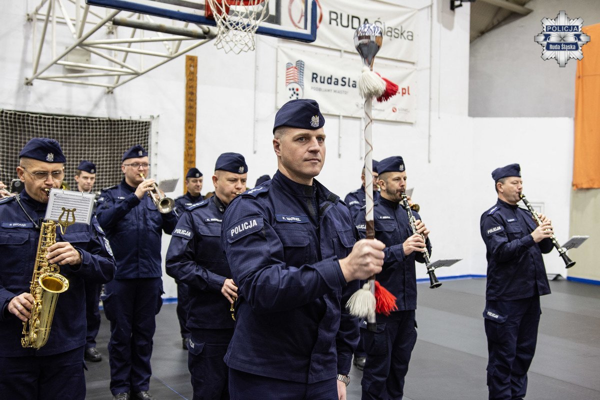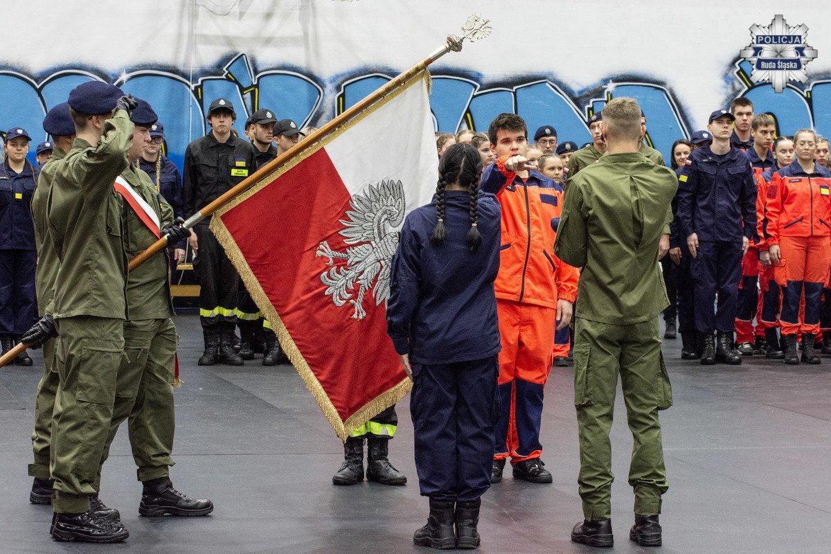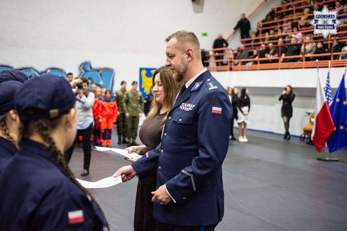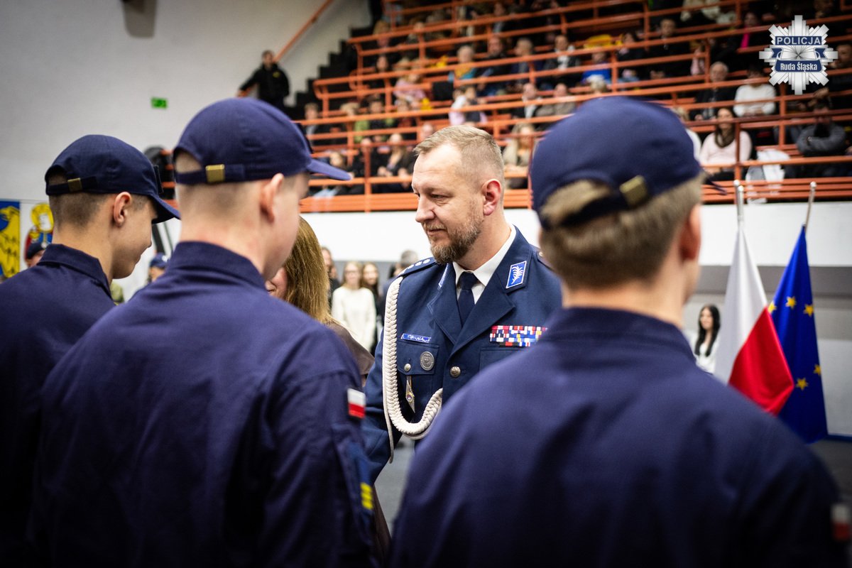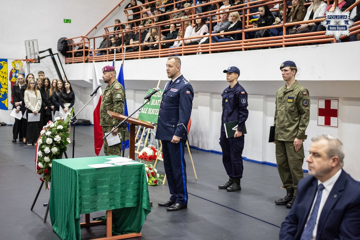 Komendant Miejski Policji w Rudzie Śląskiej insp. dr Piotr Uwijała, gościł w piątek na uroczystości ślubowania klas pierwszych szkoły mundurowej. Młodzież zgromadziła się na hali rudzkiego MOSIR-u, gdzie odbył się uroczysty apel z udziałem ich rodzin oraz zaproszonych gości. Wydarzenie to uświetnili policjanci z Orkiestry Komendy Wojewódzkiej Policji w Katowicach, którzy zapewnili oprawę muzyczną. Po ślubowaniu, awansach i przemówieniach, wszyscy uczestnicy przeszli pod pomnik z tablicą upamiętniającą Jadwigę Markową, gdzie odczytano Apel Poległych oraz zapalono znicze i złożono wiązanki kwiatów.